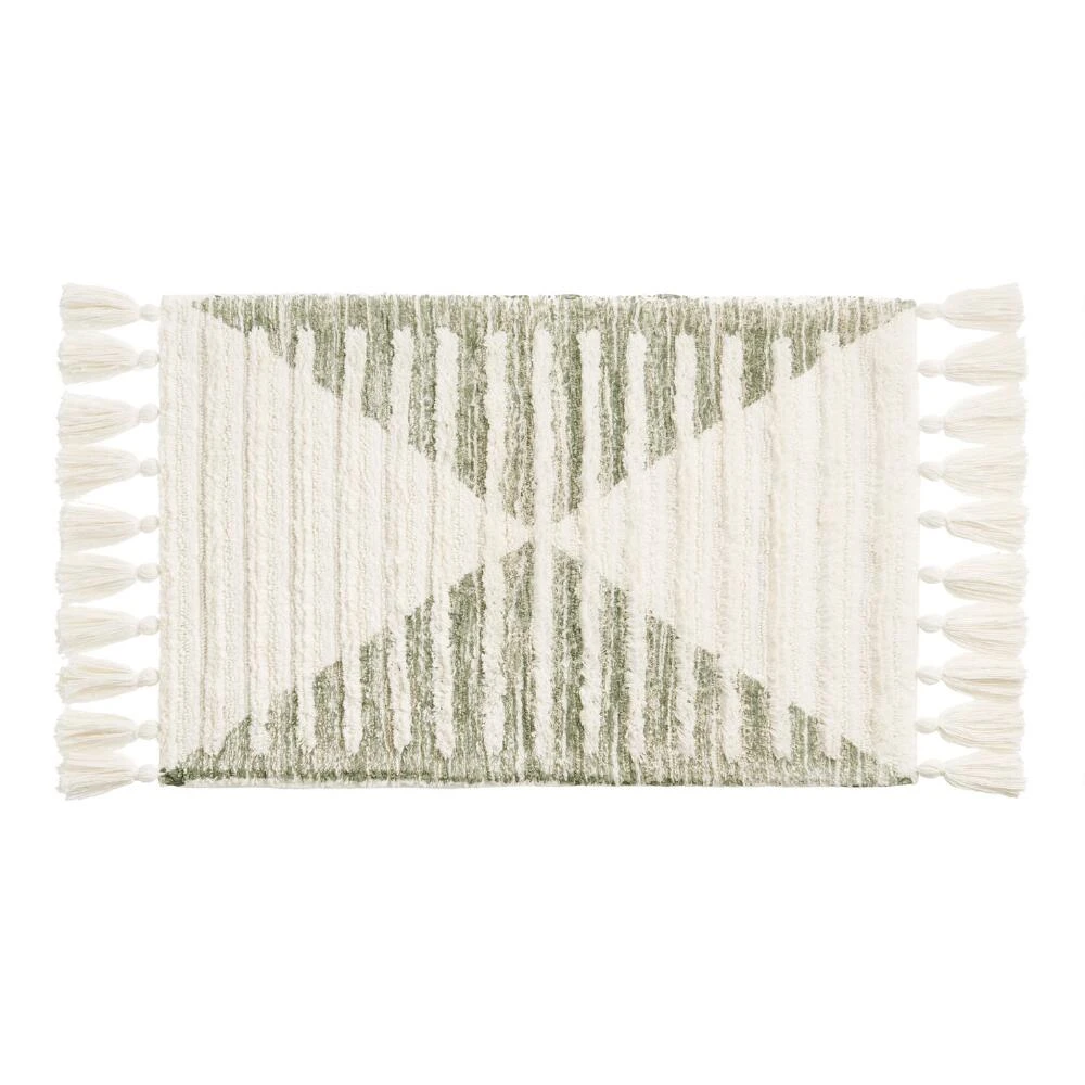 An inviting place to step, our exclusive white and sage-green diamond bath mat gives your powder room a plush update. Tufted with dimensional stripes and finished with tassels on each end, this 100% cotton shower mat cozies up minimalist spaces and complements bohemian bathroom decor with ease.