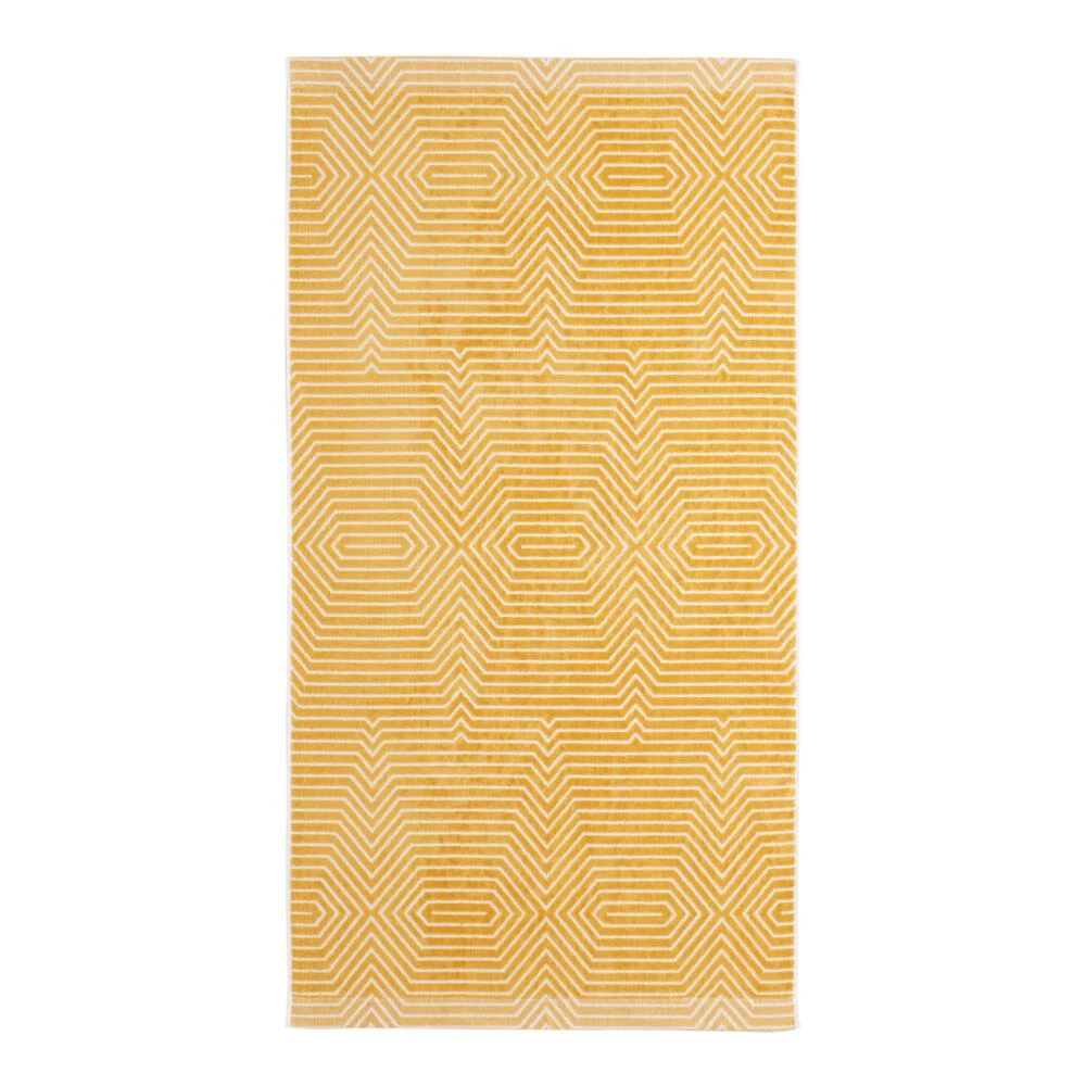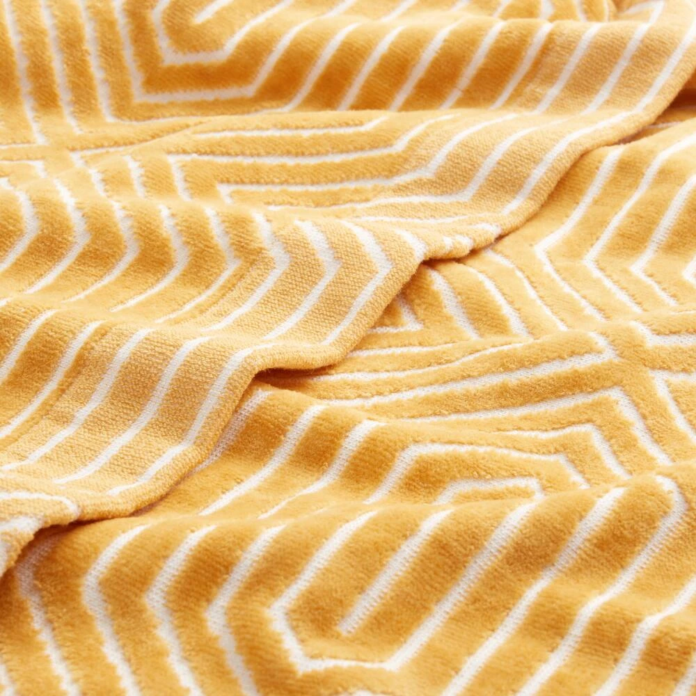 A modern take on an everyday necessity, our exclusive bath towel has a dimensional, sculpted geometric line design. Made in Portugal with a jacquard base in shades of mustard-yellow and white, it’s oh-so-soft to the touch with a luxe velour feel.