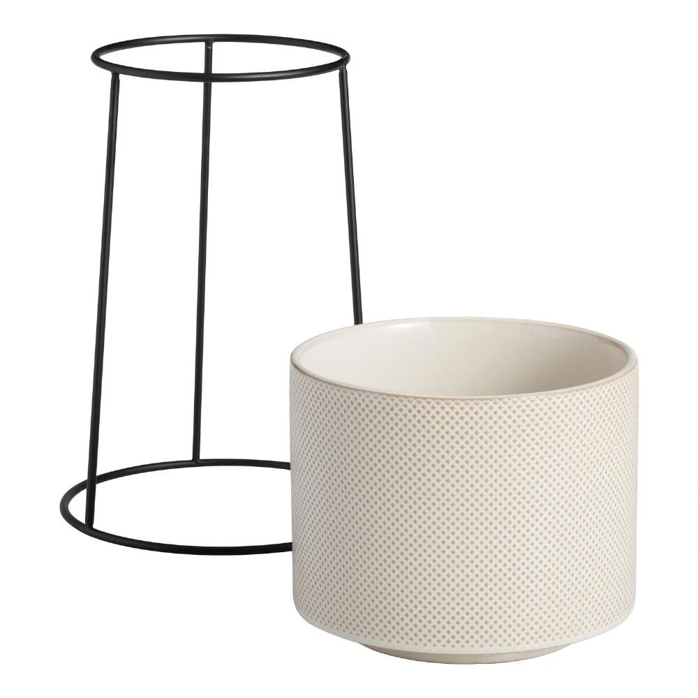 Made of glazed ceramic in a creamy ivory hue, our planter sits atop a three-legged black metal stand. Perfect for elevating potted plants or flowers, the vessel has a streamlined, cylindrical shape for a decidedly contemporary look.
