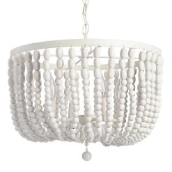 - Crafted of wood beads with antique whitewash finish and iron with white finish