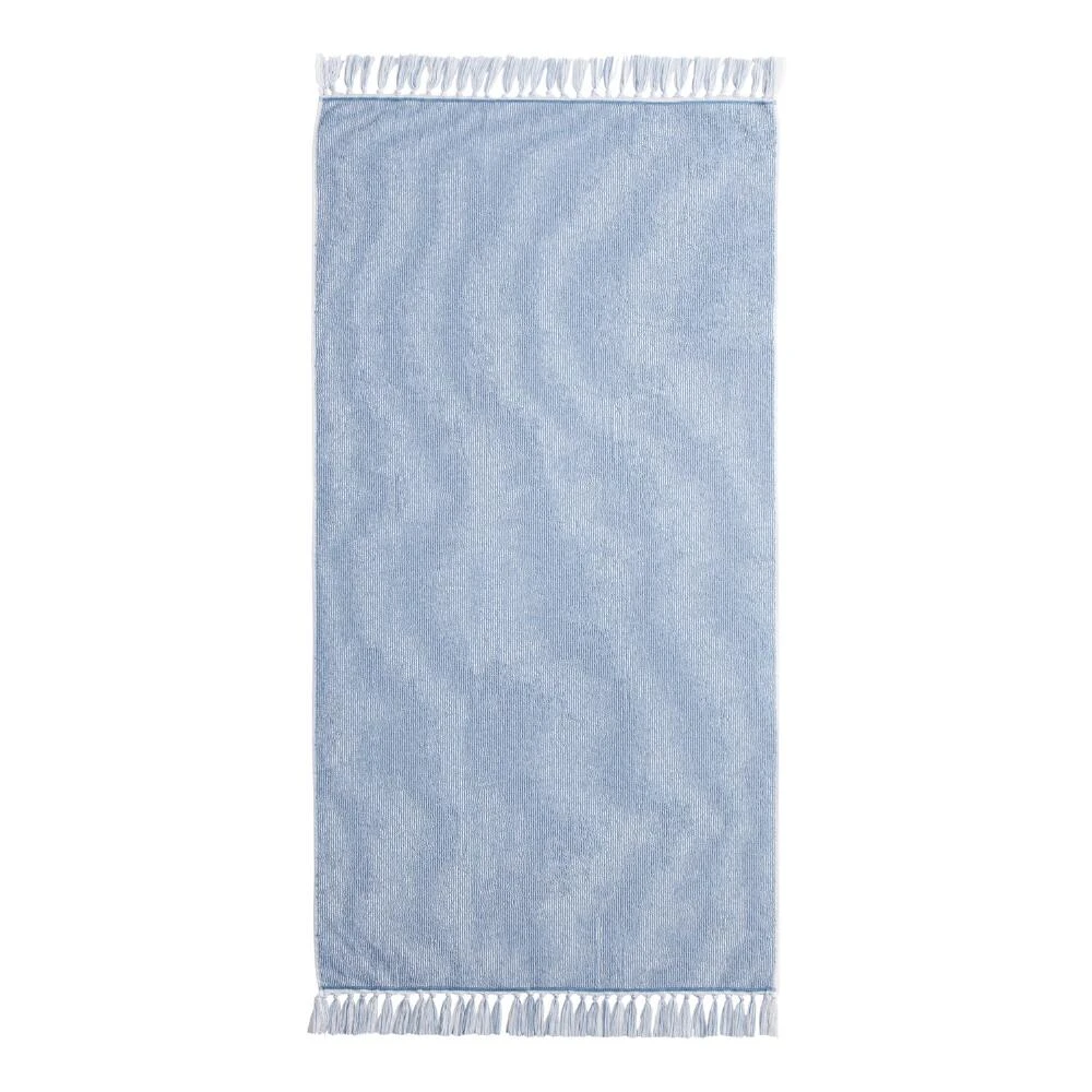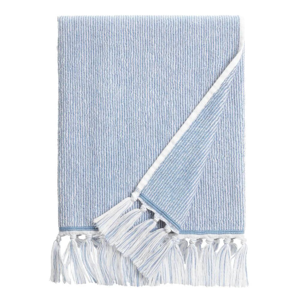 Made of absorbent and oh-so-soft 100% cotton, our exclusive bath towel is made in India with a blue and white marled design. Finished with tassels on each end, it adds a serene, subtle pop of color to your bathroom decor.