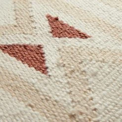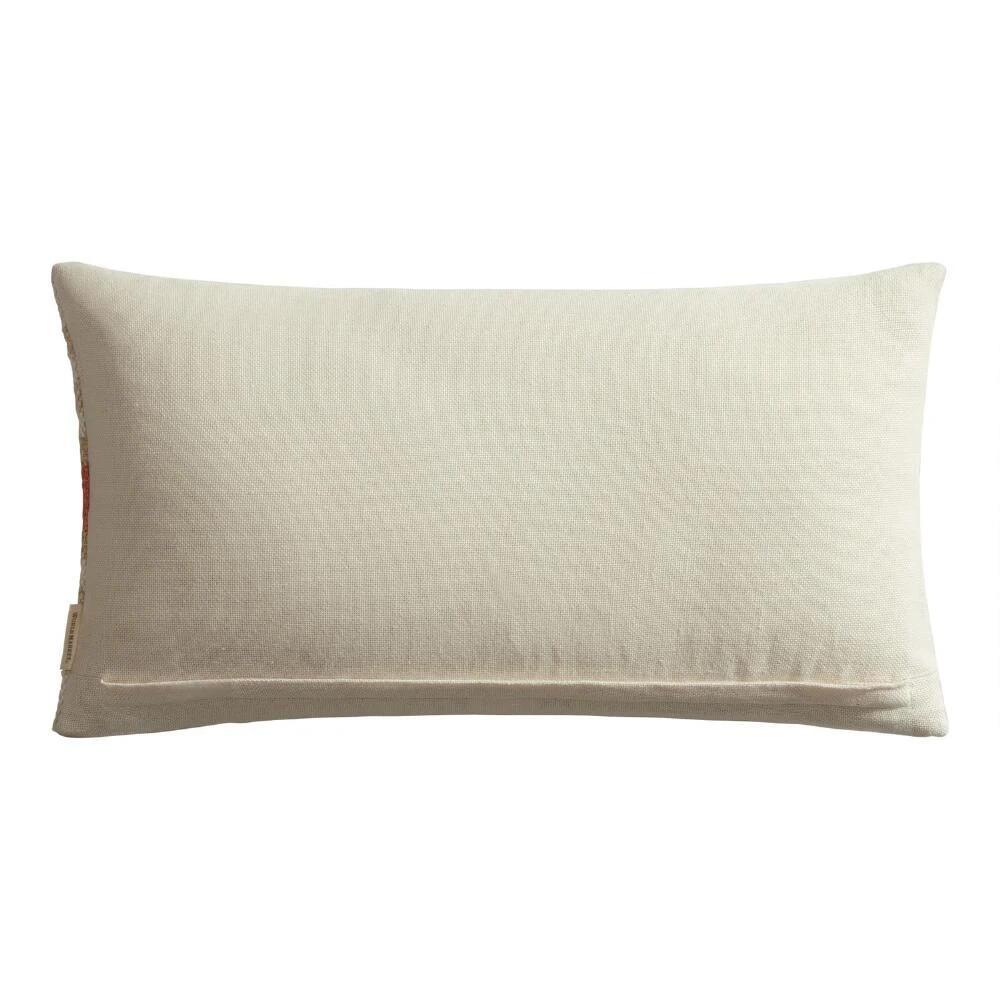 Modern meets traditional in the pattern on this striking geometric lumbar pillow that updates your sofa with contemporary and global style. Inspired by the moon and classic Mexican motifs, our exclusive woven design consists of a series of simple shapes in shades of coral, red and natural on an ivory ground. Made with an innovative process that puts recycled water bottles to good use, it adds comfort to seating indoors or outside.