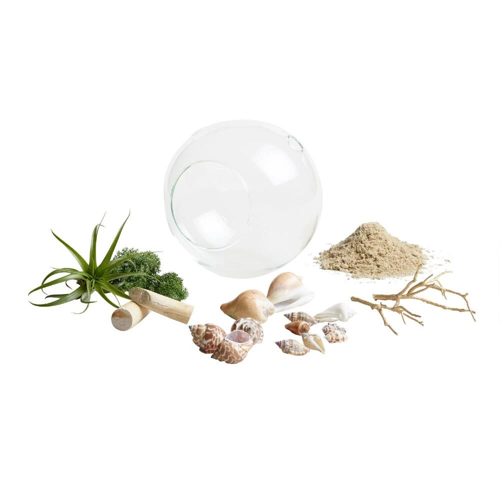 Showcase our ready-made terrarium on your tabletop or sideboard to freshen the atmosphere and create a coastal look in your living space. It features tillandsia plants that grow without soil by absorbing water and nutrients through their leaves, and shells and sand that add a beachcomber vibe.