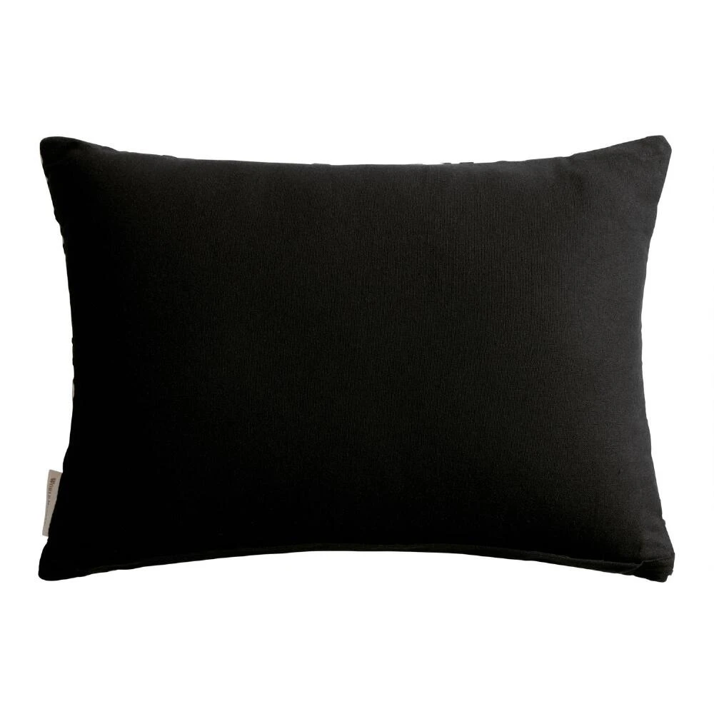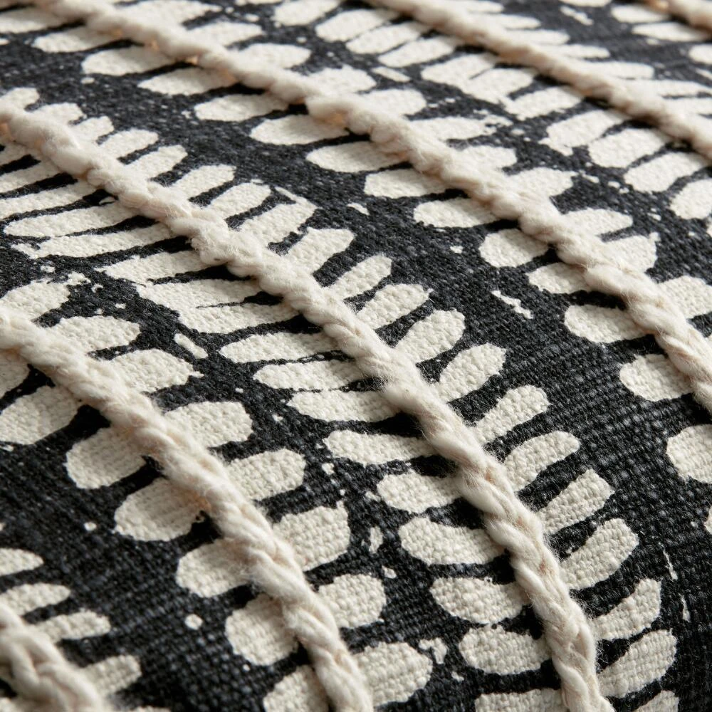 With a modern twist on a classic black and white color scheme, this on-trend screen-printed lumbar pillow offers both style and comfort. A leaf pattern in ivory is printed on a solid-black cotton slub base with braided detailing in vertical stripes throughout lending it texture. Perfect for seating areas or bedrooms, this exclusive pillow comes with a zip closure and removable insert for easy spot cleaning.