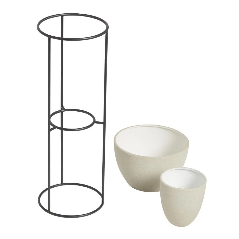 Double your greenery and elevate your style with this tall 2-tier planter. The open black metal base holds a pair of stacked gray cement pots, a small one in the middle and a broader one on top, perfect for succulents or lush trailing plants.