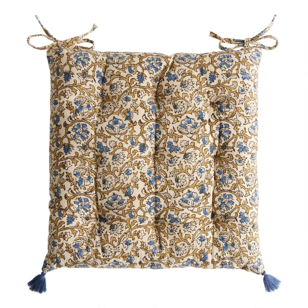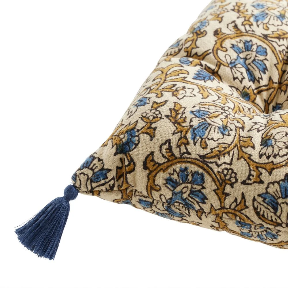 This handcrafted floral Jaipur block-print chair cushion in blue, black and ivory is the perfect addition to your home decor. The tradition of block printing is an intricate process Indian artisans have been perfecting since the 12th century. A design is hand-drawn and carved into a wooden block, then dipped in dye and stamped carefully on stretched, hand-dyed fabric. Each one-of-a-kind piece is a unique work of art.