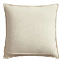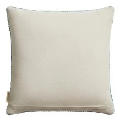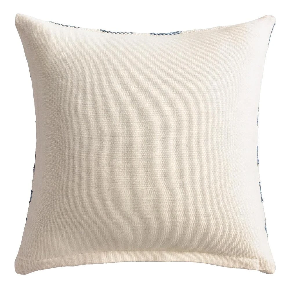 Our exclusive throw pillow features a textured blue geometric design against a cream background. Woven with thread made from recycled plastic bottles and complete with a plush removable insert, this toss pillow is appropriate for both indoor and outdoor spaces.