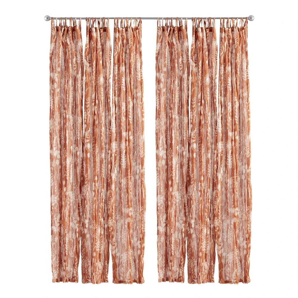 Dreamy, light and airy, our botanical-patterned crinkled cotton-voile curtains are wonderfully adaptable to a wide range of decorating styles. These tie-top window panels provide privacy and allow soft, diffused light to enter, while the teal and rust colorways mean you can find the perfect hue for your room.
