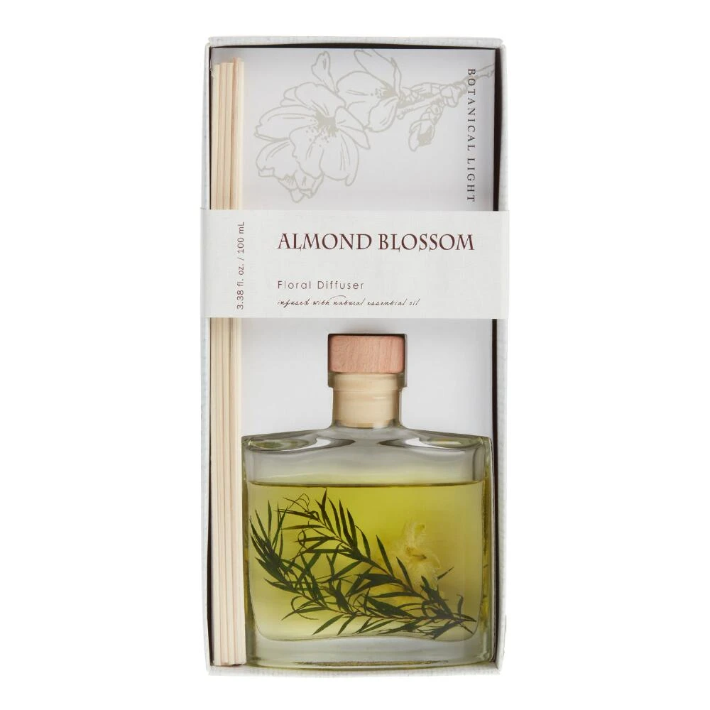 Refresh your home for the new season with reviving spring fragrance courtesy of our Almond Blossom diffuser. The pretty clear-glass jar features real botanical stems that help infuse the oil with uplifting aromas. Zesty top notes of moonflower, orange Valencia and neroli give way to lilac, ylang ylang, Turkish rose and white flowers, and finally woodsy and vanilla base notes. Simply place the reeds in the oil and let the fragrance develop.