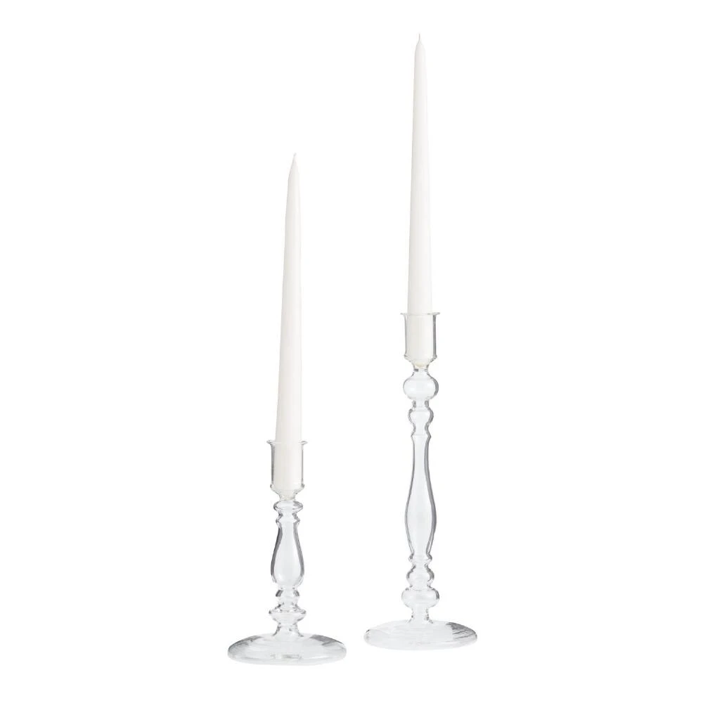 This clear glass taper candle holder has a classic turned shape that pairs as well with antique furniture as it does with modernist decor. Available in two different heights, this tall and slender candlestick is perfect for displaying one or more dramatic taper candles on your mantel, console table, or bookshelf.