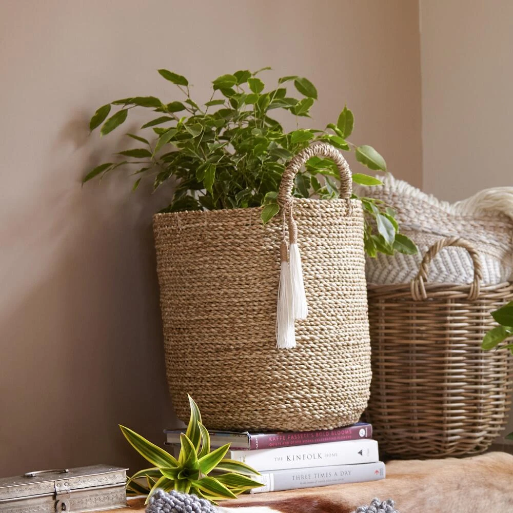 Crafted of seagrass, outfitted with loop handles and accented with white rope tassels, our casual storage tote is naturally warm and effortlessly chic.