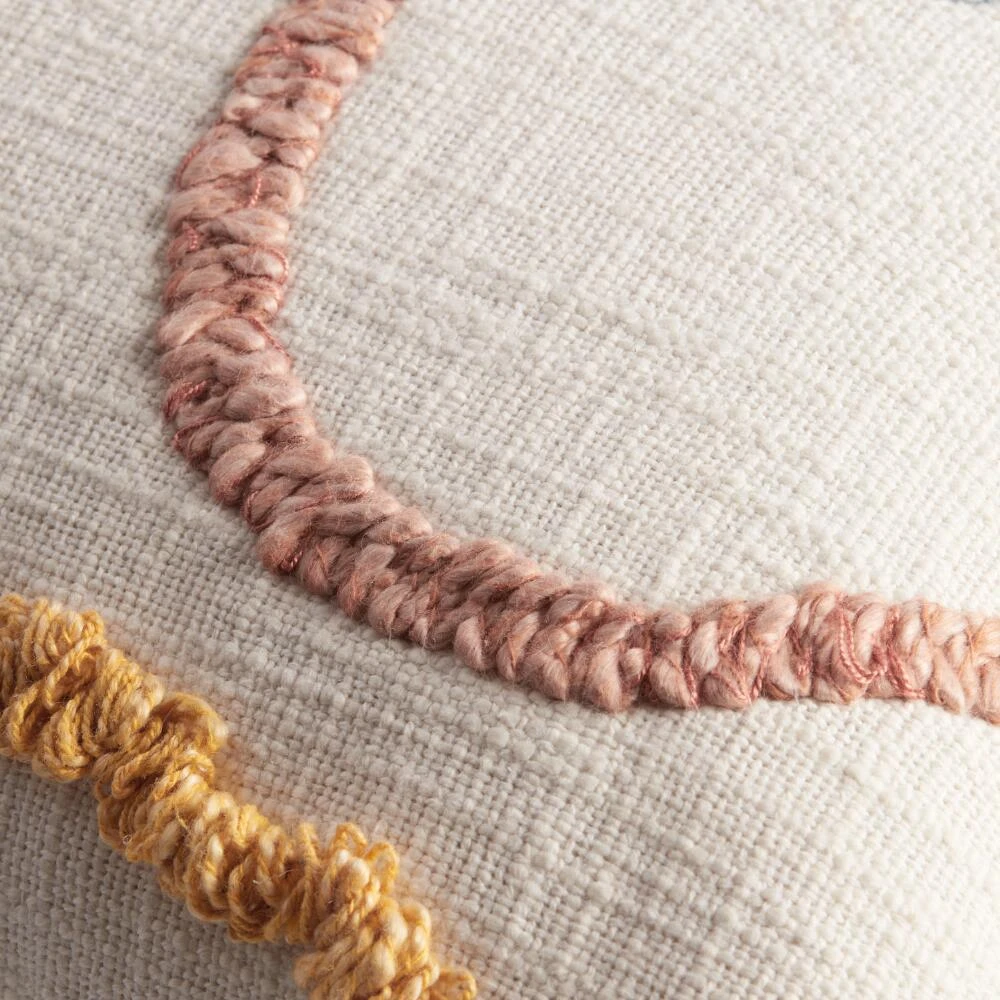 Featuring colorful yarn-dyed embroidered lines on a woven ivory ground with ivory canvas backing, this artful toss pillow brings texture and comfort to seating. Mix and match with our variety of other colorful throw pillows to add a fun, one-of-a-kind look to any space.