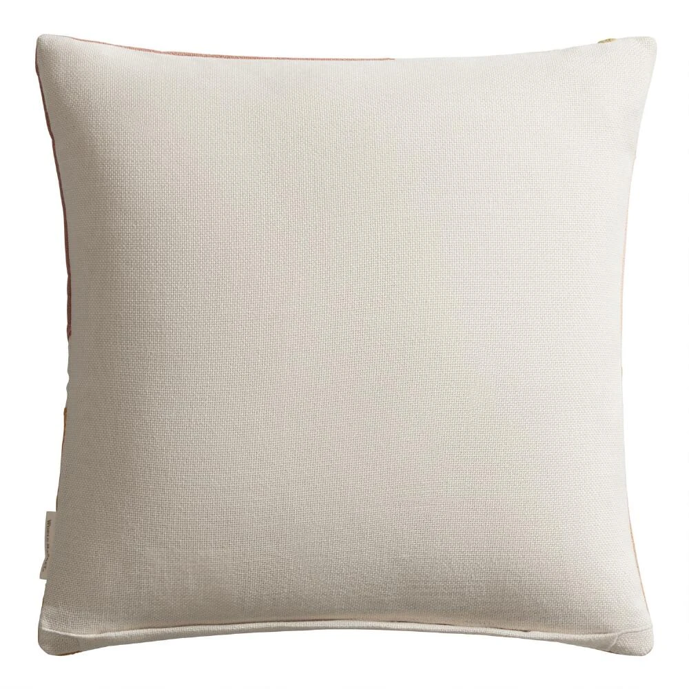 An elevated addition to your cushion collection, this indoor-outdoor throw pillow features beautiful tropical leaves with charming embroidered embellishments. Set against an abstract coral and gold patchwork, evocative of an island sunrise, the variegated botanical patterns are intricately crafted with teal and green stitching. Finished with a solid ivory back, it’s made with an innovative process that puts recycled water bottles to good use.