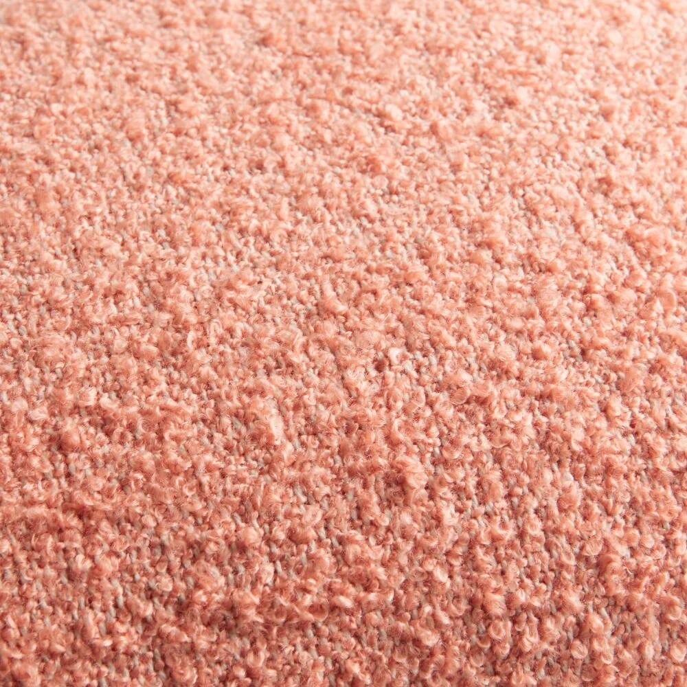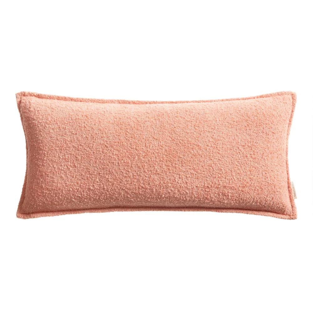 Our exclusive, versatile extra-wide lumbar pillow will make a big statement in any home. With hints of ivory on a cheerful coral boucle base, this accent pillow is handwoven of soft-to-the-touch fabric with a glam gold zipper and subtle flange around the edges.