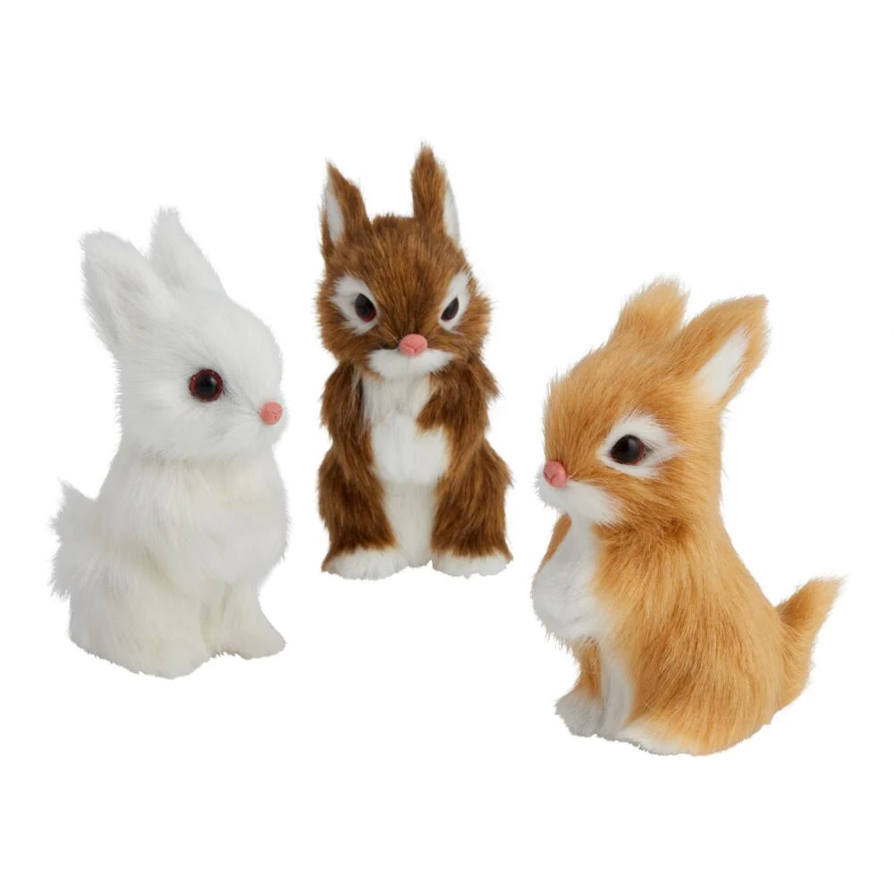 Hop into spring with our bright-eyed, pink-nosed bunnies. Crafted of faux fur in white, tan and brown, these cuddly creatures lend adorable appeal to Easter centerpieces and displays.