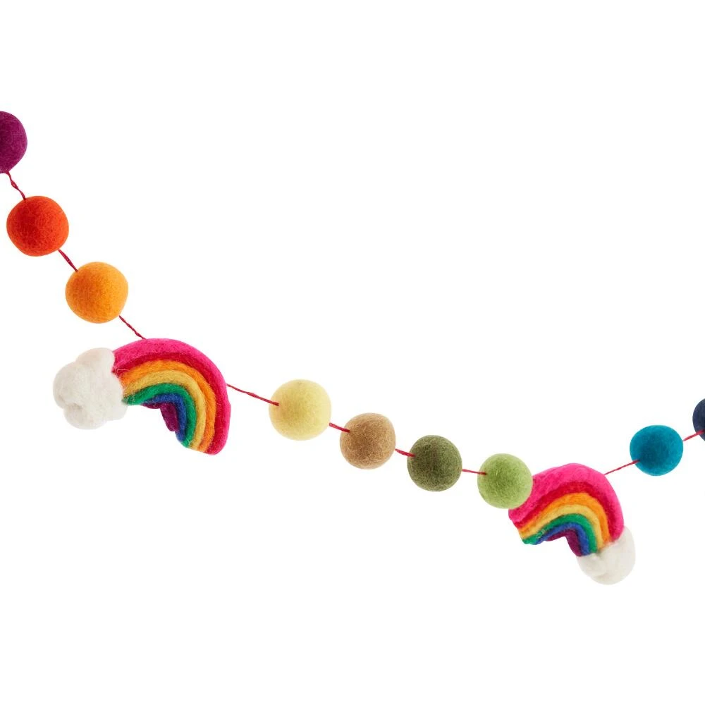 Handcrafted in Nepal from cozy felted sheep’s wool, this charming garland combines three cloud-accented rainbows with an array of festive pom-poms. Hang it in the nursery, playroom or anywhere else that could use a little color and a lot of cheerful style.