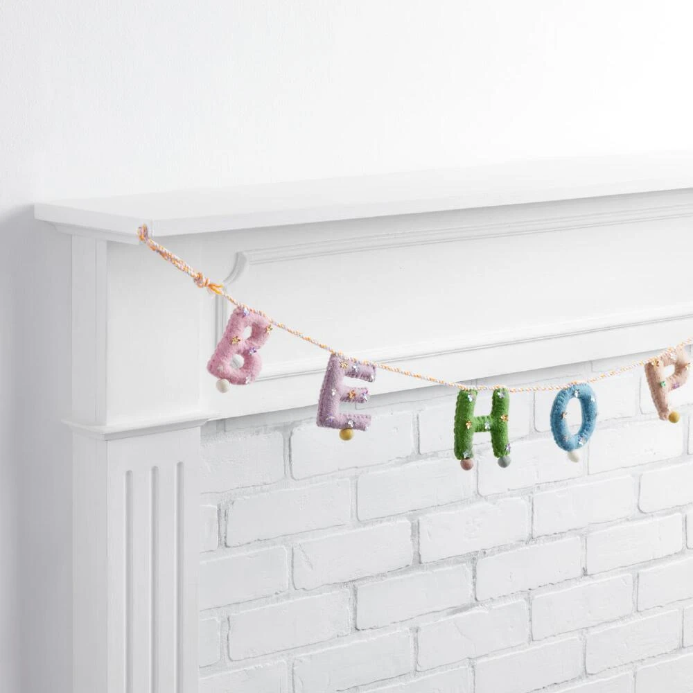 Warm and whimsical, our “Be Hoppy” garland is handcrafted by female artisans in villages around Delhi, India. Made of soft felted wool and accented with flower-shaped sequins and festive pom-poms, this pastel hanging decor brings inviting texture and shine to your Easter season.