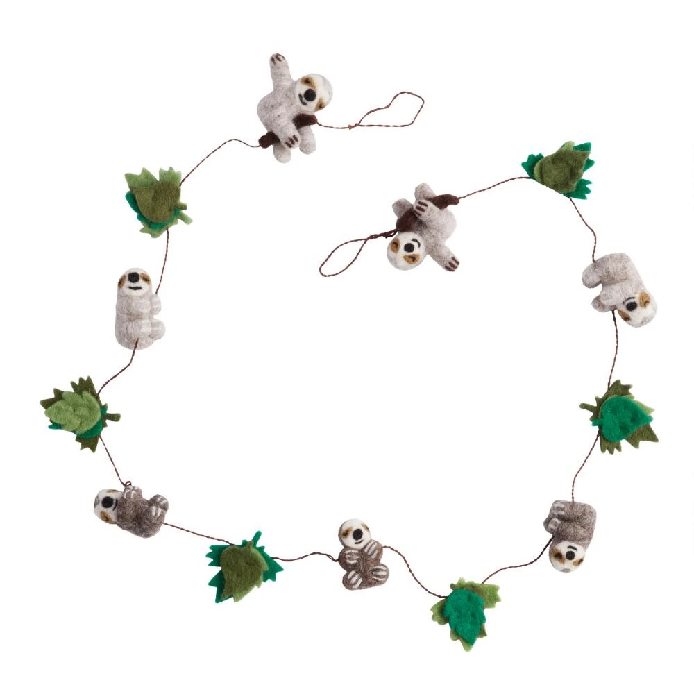 Seven sweet, snuggly sloths hang along this adorable garland, accented with clusters of lush green leaves. Each element is individually crafted in Nepal from soft felted sheep’s wool and sewn together by hand. As a whimsical touch in the kitchen or office or a cozy accent for kids’ rooms, it’s full of homespun charm.