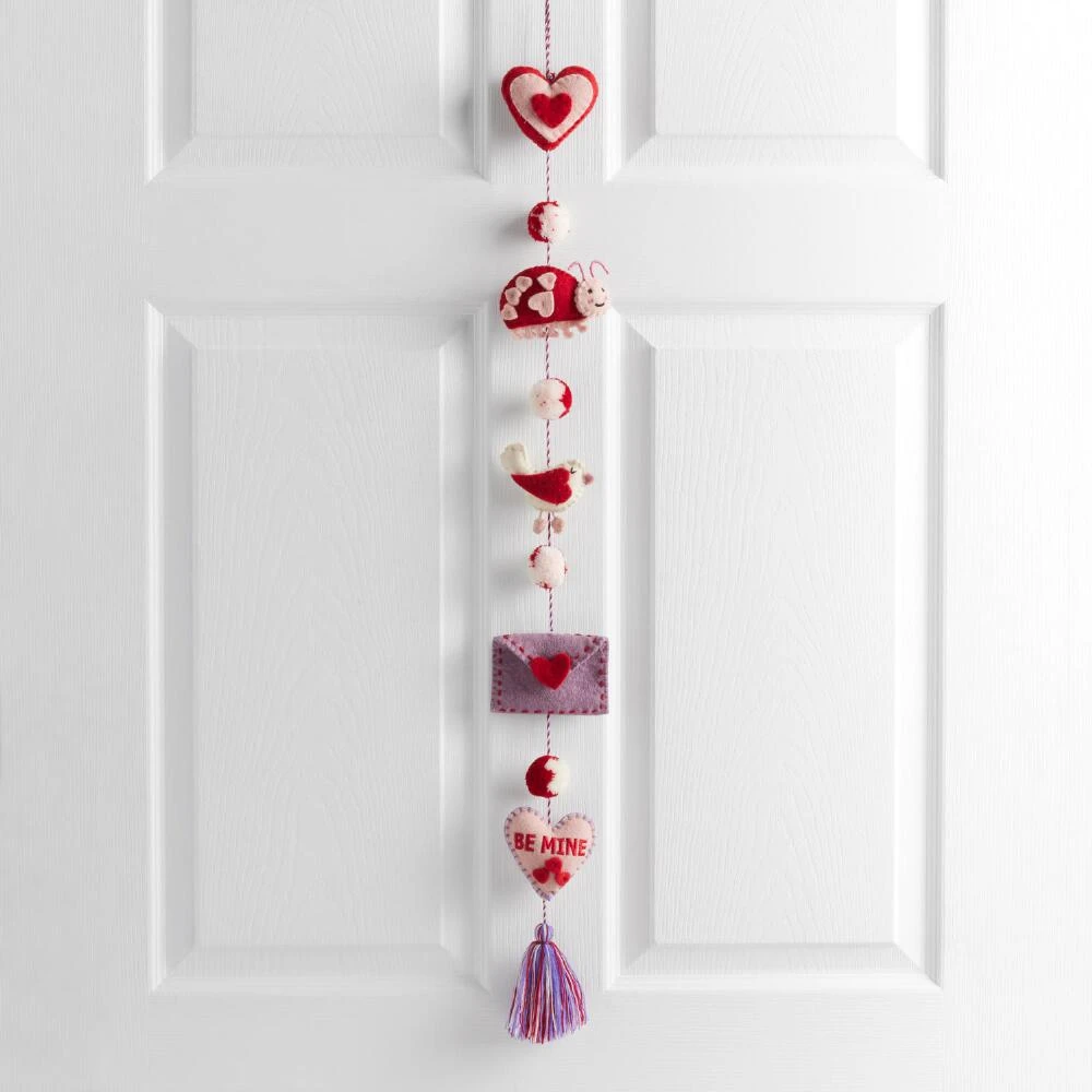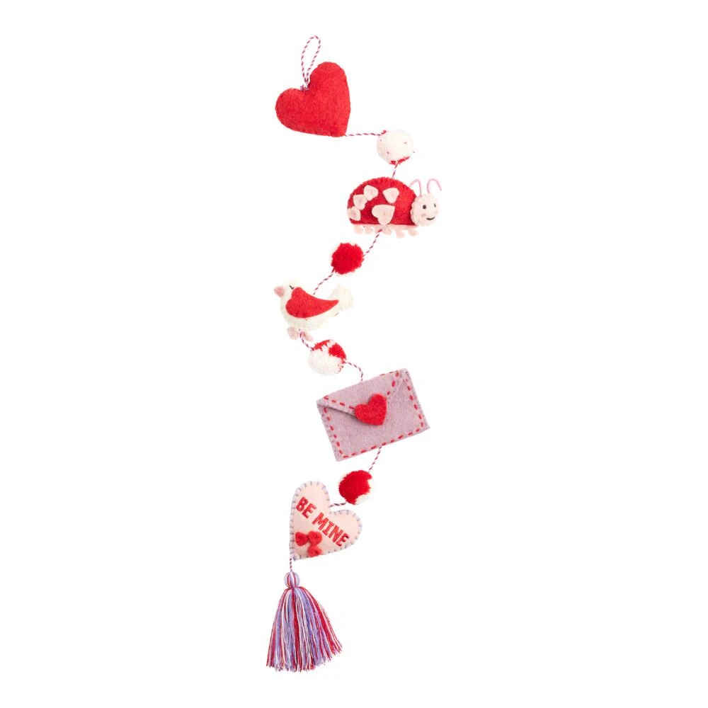 Lovingly handcrafted from soft felted wool, our vertical garland warms hearts wherever it hangs. Accented with fluffy pom-poms and a festive tassel, it features a ladybug, a lovebird, a pair of hearts and a snap-fastened envelope where you can hide a note or a small treat for your Valentine.