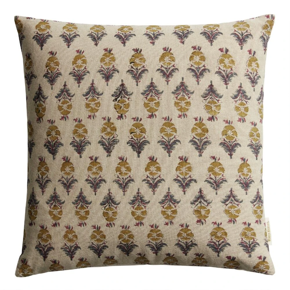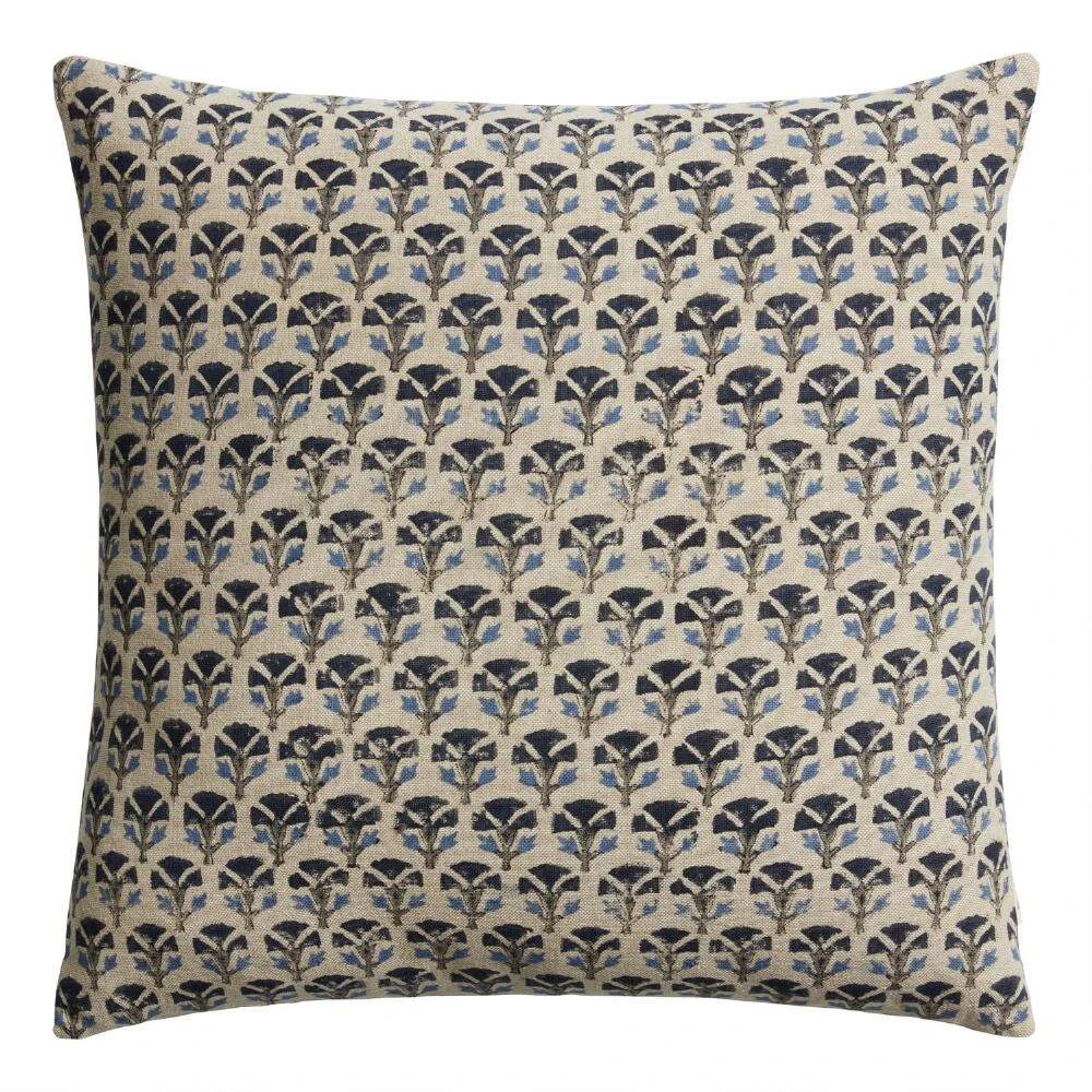 This stunning throw pillow is adorned with a dainty floral design in blue and teal or gold and rust with a beautiful wood-button closure on the back. The tradition of block printing is an intricate process Indian artisans have been perfecting since the 12th century. A design is hand-drawn and carved into a wooden block, then dipped in dye and stamped carefully on stretched, hand-dyed fabric. Each one-of-a-kind piece is a unique work of art.