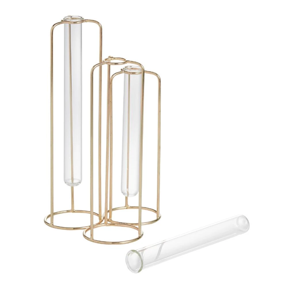 Fashioned in the shape of three separate test tubes, our gold-wire and glass bud vases offer a simple yet contemporary way to display single stem flowers. Arranged at varying heights, they’re also great for propagating succulents.