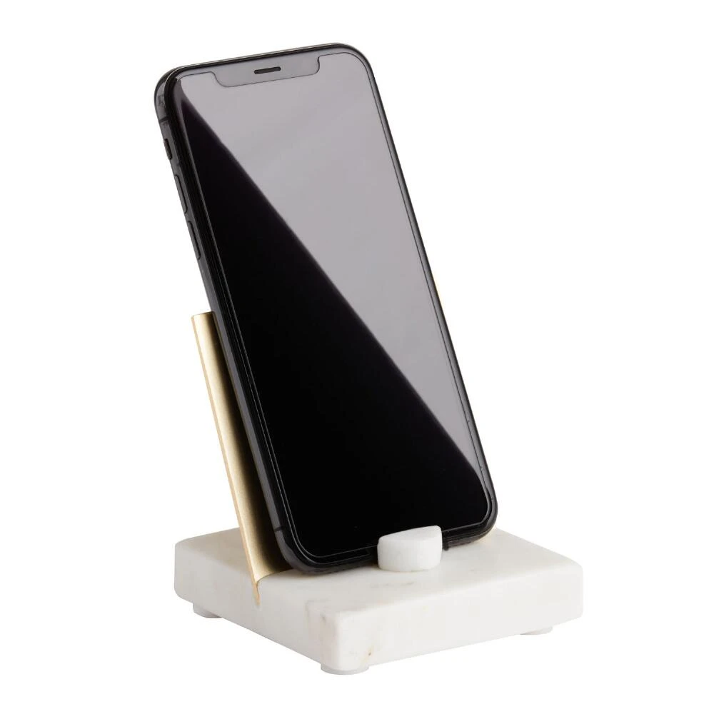 Perfect for watching videos, checking messages or simply keeping tabs on your device, our stylish stand lends a polished look to propping up your phone. Its handsome slab of white marble and glossy sheet of gold metal support any smart phone at an elegant angle.
