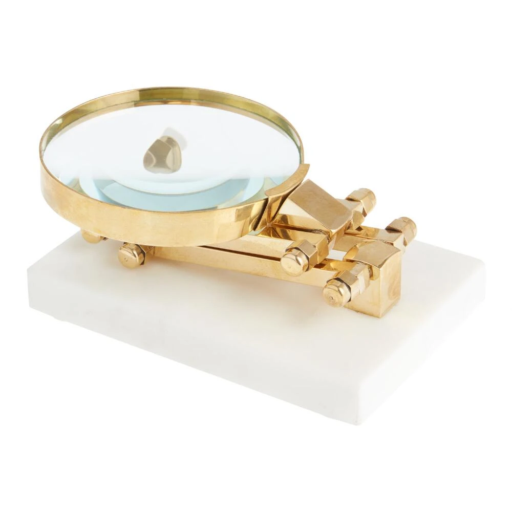 Accessorize your desktop with our sophisticated gold magnifying glass featuring an adjustable arm. Set on a gray-flecked white marble stand, this modern decor is an intriguing addition to a mantel or shelf.