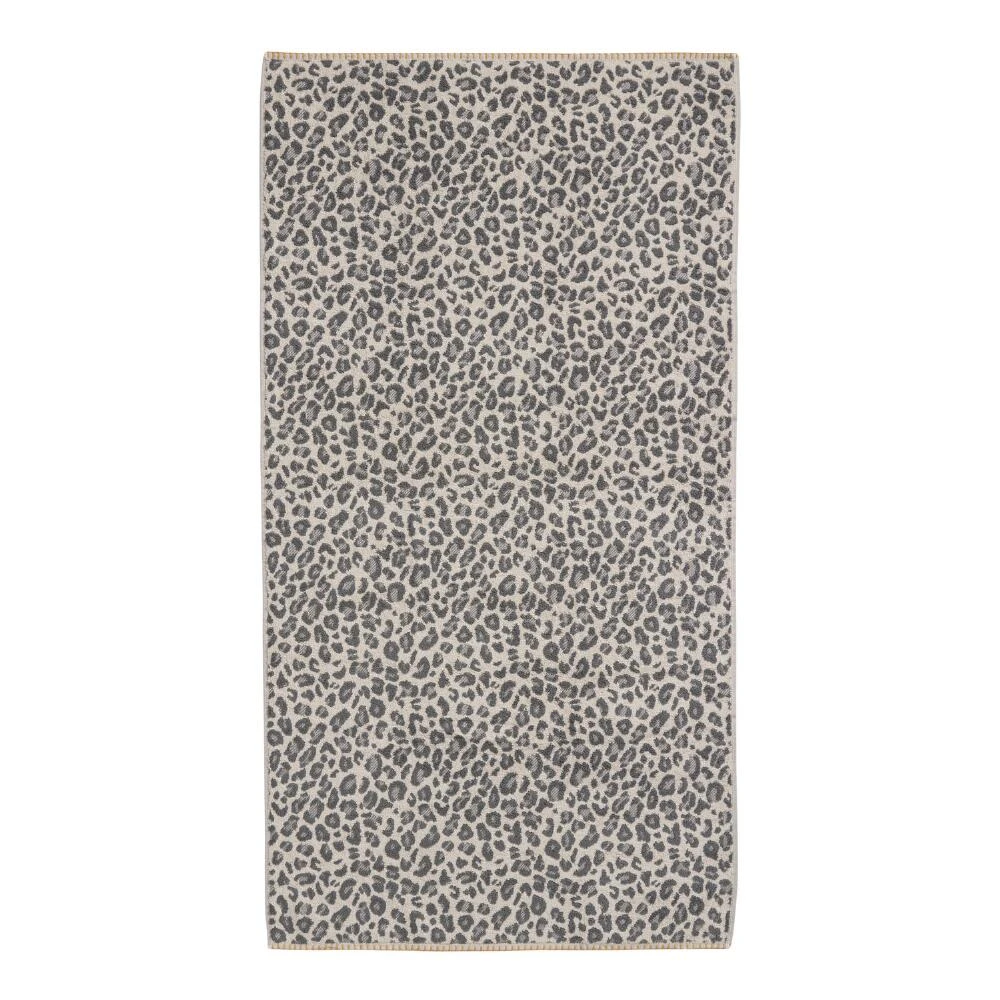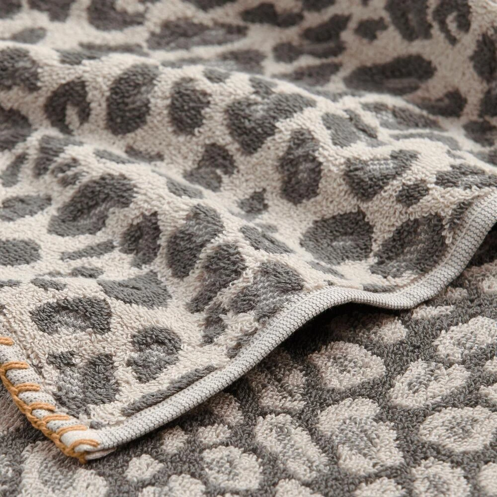 Our exclusive reversible bath towel features an allover leopard print in ivory and tones of gray, complete with a mustard-yellow blanket stitch on the ends. Made in Portugal of 100% cotton, it’s equal parts soft and chic and brings some wild style to your washroom.