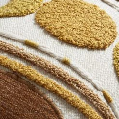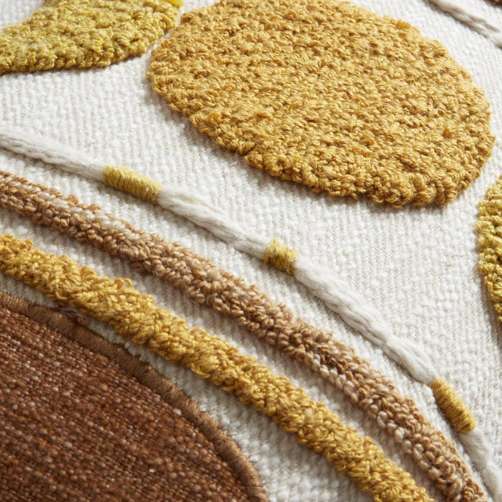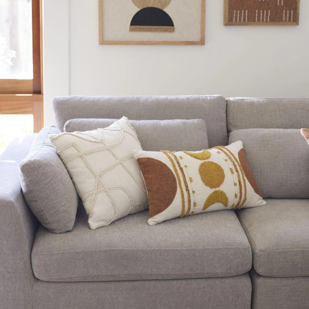 Send your home decor out of this world with this exclusive celestial-inspired lumbar pillow. This ivory toss pillow is embellished with tufted and woven stripes and phases of the moon in gold and rust. With a solid natural-hued back and a removable insert, this is the perfect pillow for accenting any home decor from boho to desert-chic.