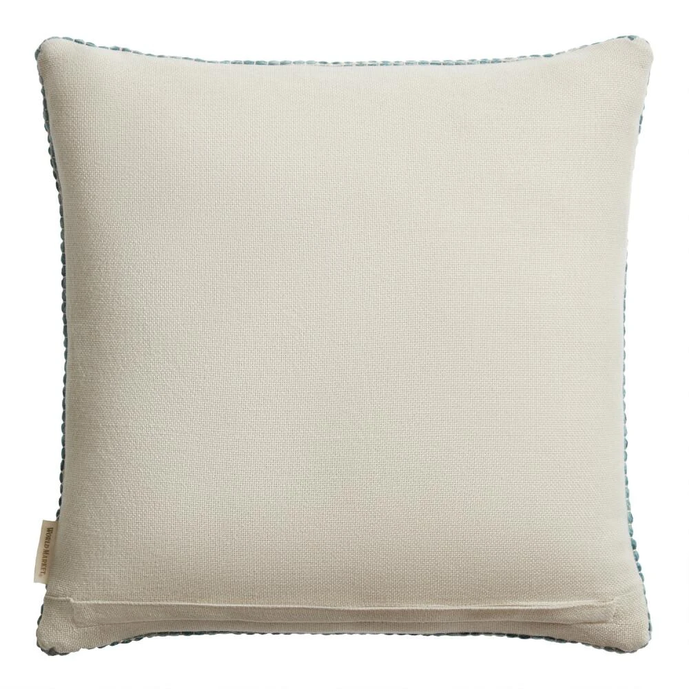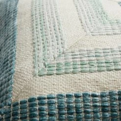 With a chic handcrafted, artisanal vibe, this throw pillow features a concentric-square pattern in cool tones of green on an ivory ground. Full of relaxed, tropical-island appeal that evokes shaded verandas and refreshing breezes, it’s finished with a solid ivory back. Made with an innovative process that puts recycled water bottles to good use, it’s perfect for seating areas both indoors and outside.