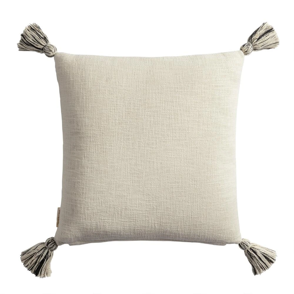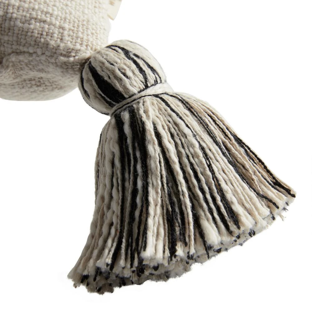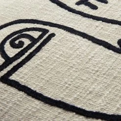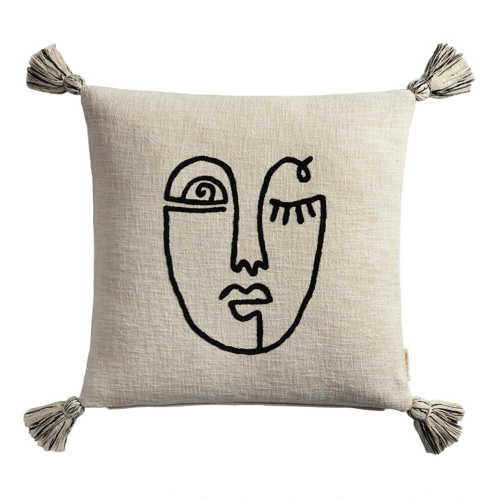 Elevate your mod home decor with this delightful embroidered throw pillow. Perfect as a standalone accent or paired with our other toss pillows for a more complete look, this pillow’s abstract face is rendered in black yarn on a textured ivory cotton ground. With playful ivory and black yarn tassels on all four corners, our throw pillow is the perfect addition to any room in your home.