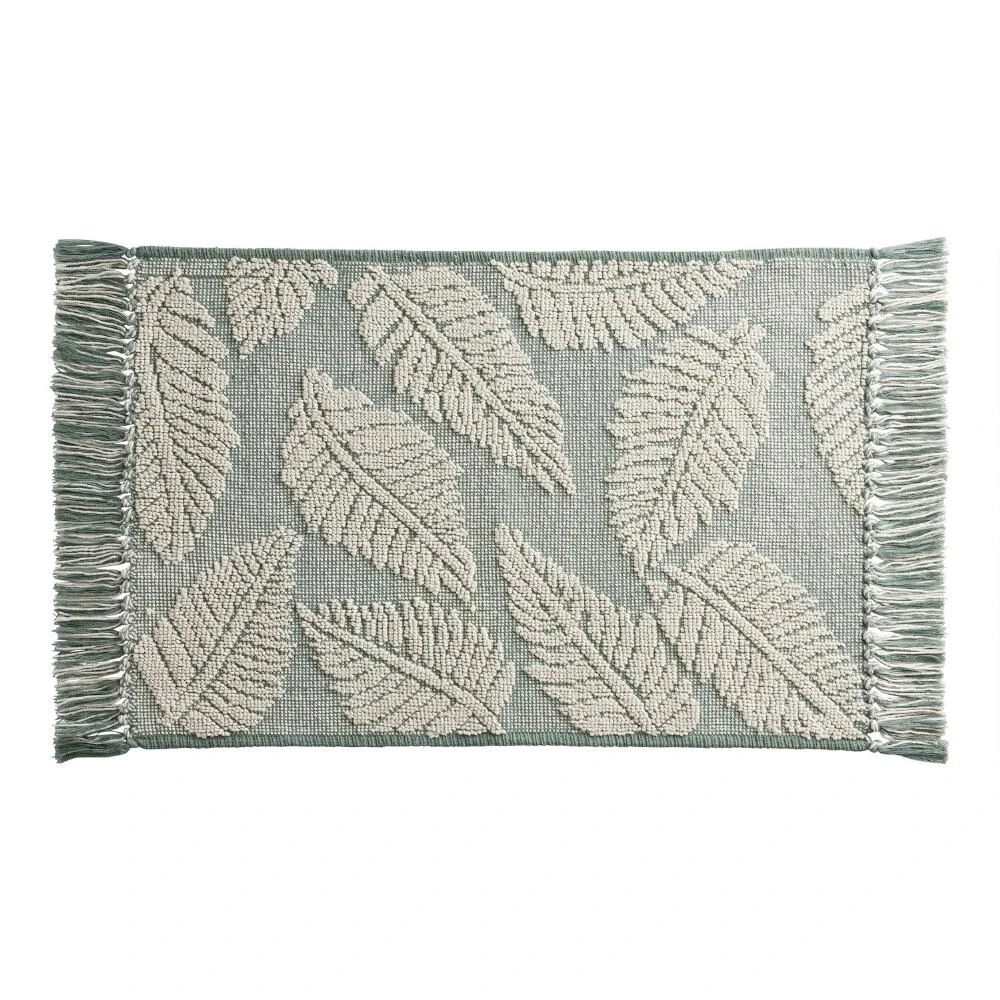 Our exclusive flatwoven bath mat is adorned with a tropical foliage design inspired by palms found in Jakarta, Indonesia. With a soft sage-green and white palette to bring an element of the outdoors in plus framing tassels on each end, it instantly creates a calming, spa-like feel in your bathroom.
