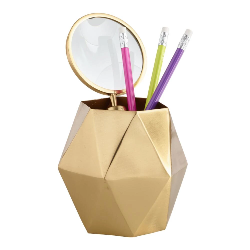Store pencils and pens in stunning style with our gold metal pencil cup. With a bold geometric silhouette and dazzling finish, it’s a glamorous addition to any office.