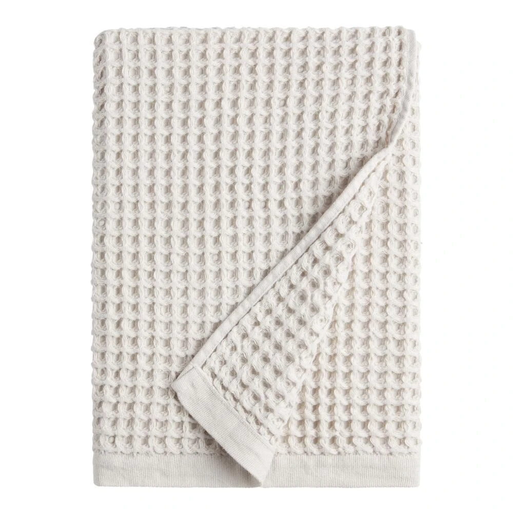 Experience spa-like luxury in the comfort of your home with our exclusive light gray cotton waffle-weave bath towel. It has a soft touch and adds a sophisticated look to any washroom.