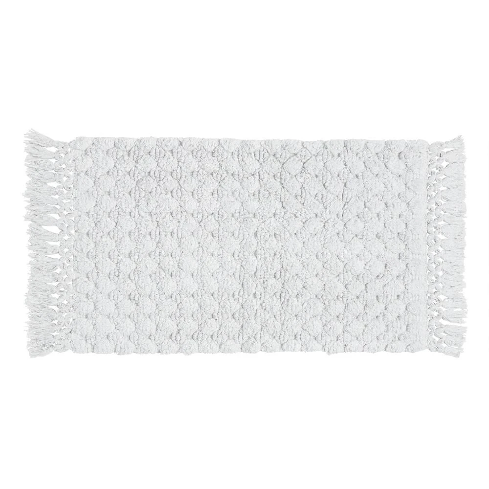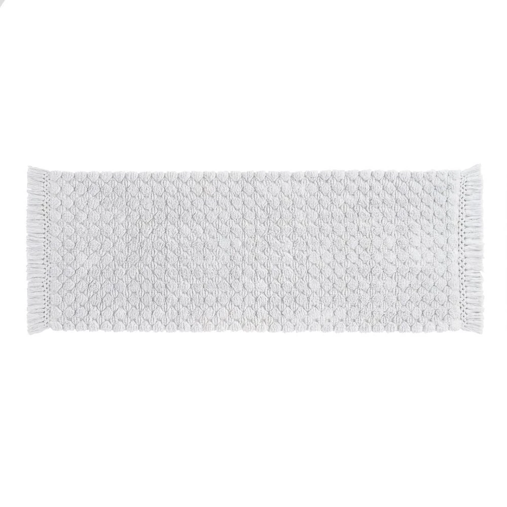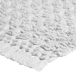 Our exclusive hand-loomed bath mat is woven of light gray yarn in a pattern of soft dots. Available in two sizes, this plush addition to your bathroom decor has knotted tassels at both ends.