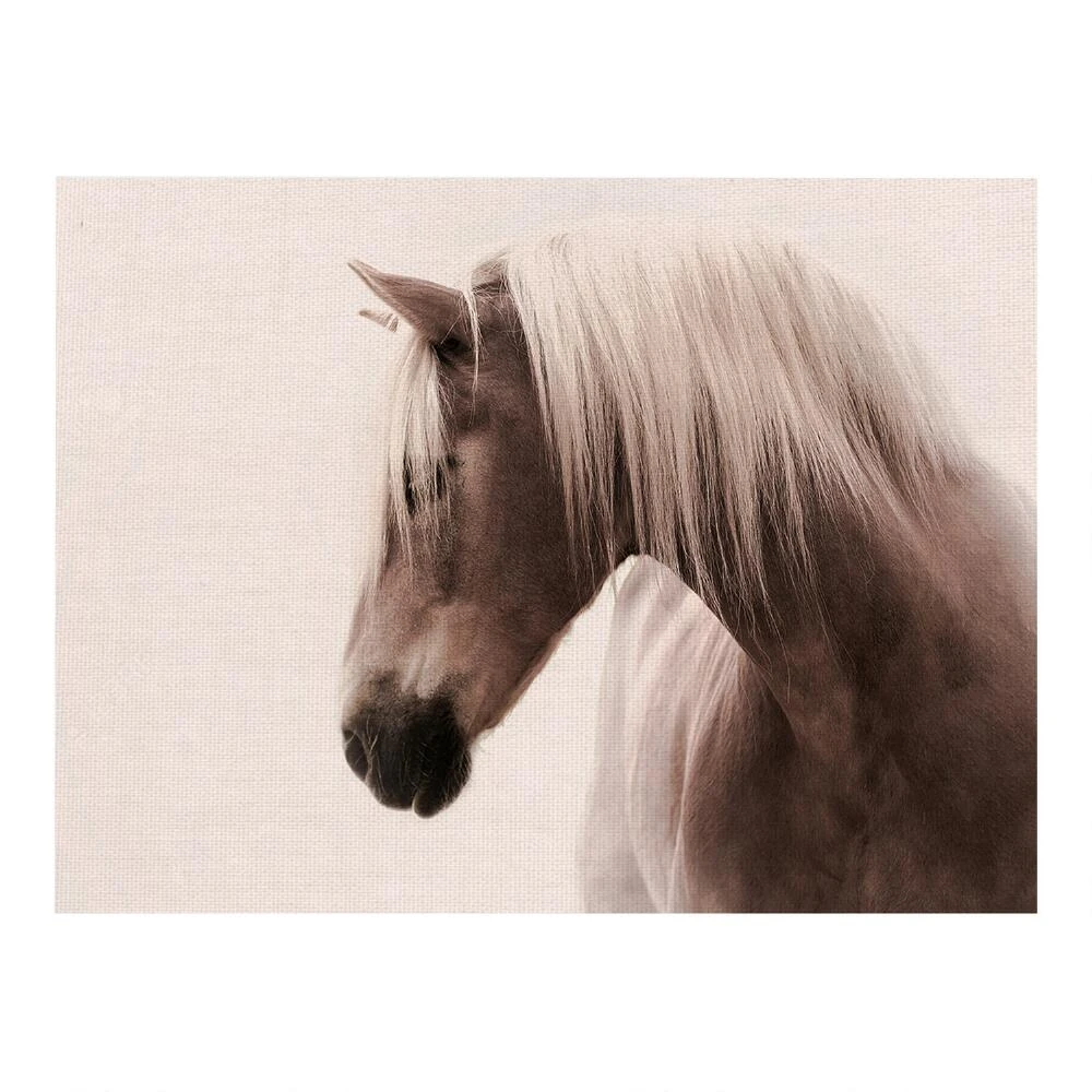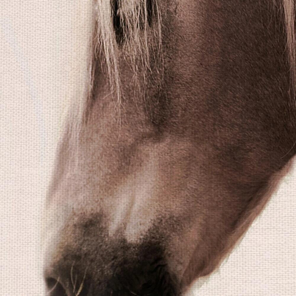 Rendered in dreamy sepia tones, this stunning photograph wall art captures a horse, its head in profile, emerging from the mist. Hang this gallery-wrapped canvas wall decor in your bedroom or living space for a touch of tranquil style.