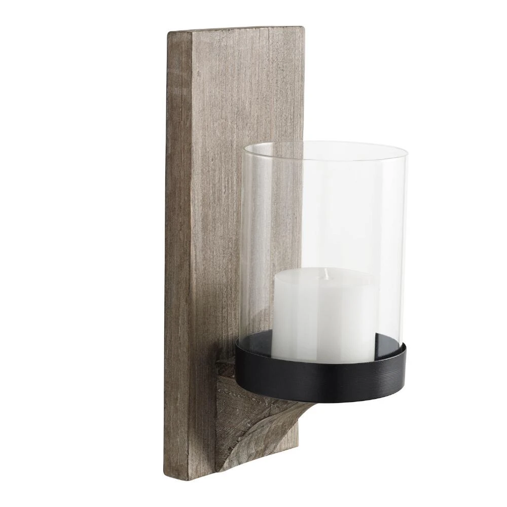 With a clean-lined silhouette, our Mason candle wall sconce features a glass cylinder with a black metal base on a weathered wood backing. This compact wall sconce is a lovely decor accent that’s perfect for illuminating your space with the ambience-enhancing light of a pillar candle.