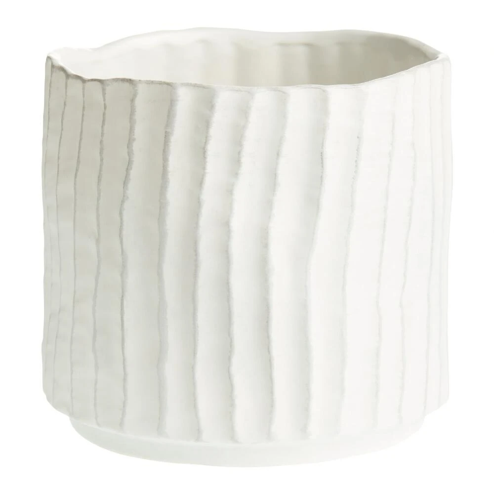 Completely unique thanks to the artisan who handmade it, this planter has a one-of-a-kind organic, wavy rim and dimensional ribbing details. Hand-painted with a matte white glaze that allows a touch of the natural gray clay to peak through, this pot makes an artful home for any houseplant.