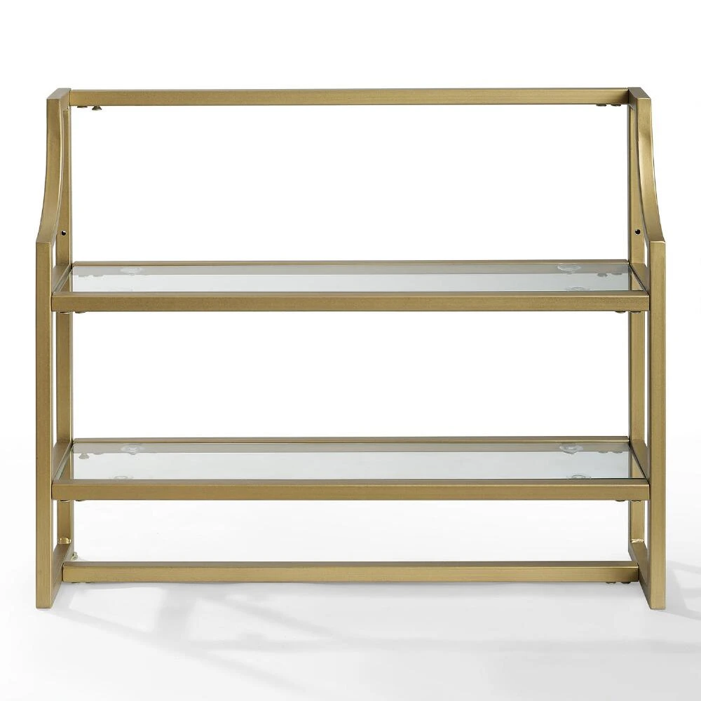 - Crafted of steel with antique gold powder-coated finish and tempered glass