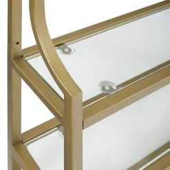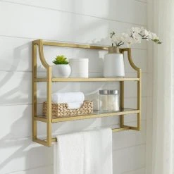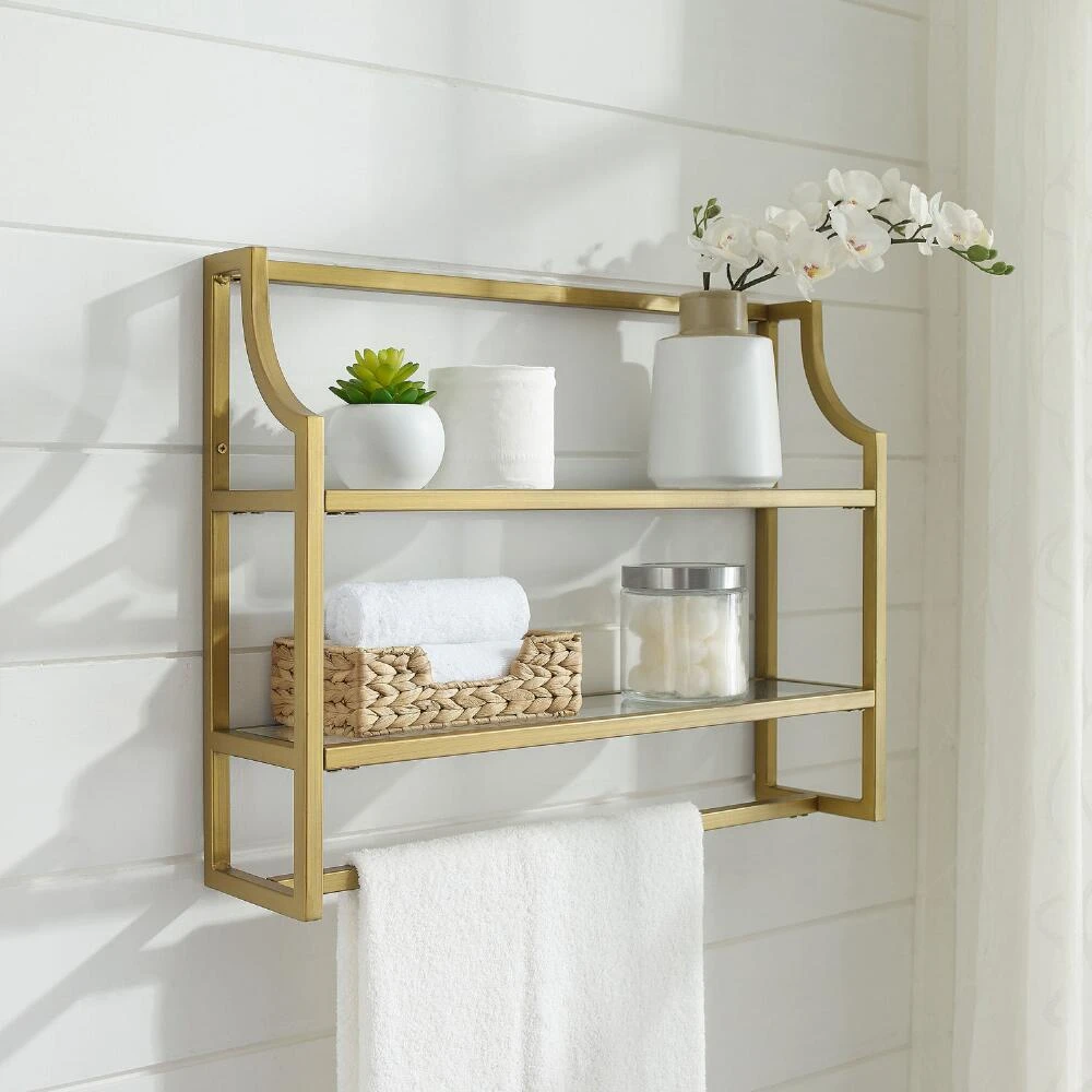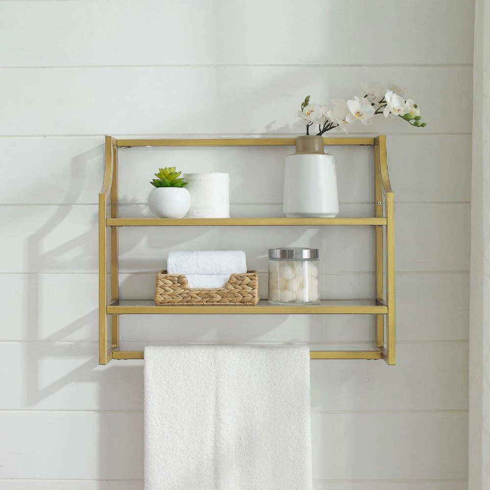 A compact bathroom storage solution, our modern wall shelf neatly stores your essentials without compromising floor space or looks. Complete with a towel bar, it has a sculptural pagoda-style steel frame finished in antique gold that houses two tempered glass shelves for convenient organization with a sleek appeal.