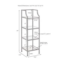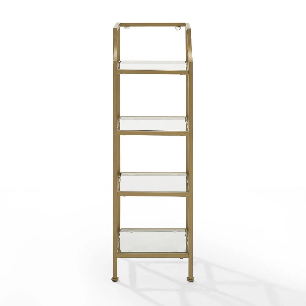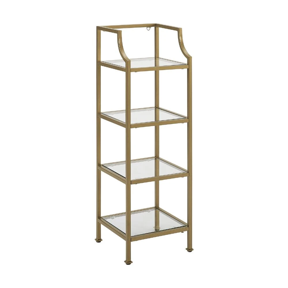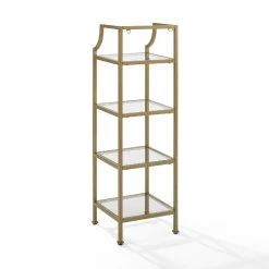 A compact bathroom storage solution, our modern etagere shelf neatly holds your essentials with a petite footprint and mid-century-inspired look. It features a sculptural pagoda-style steel frame finished in antique gold, housing four tempered-glass shelves for convenient organization with a sleek appeal.