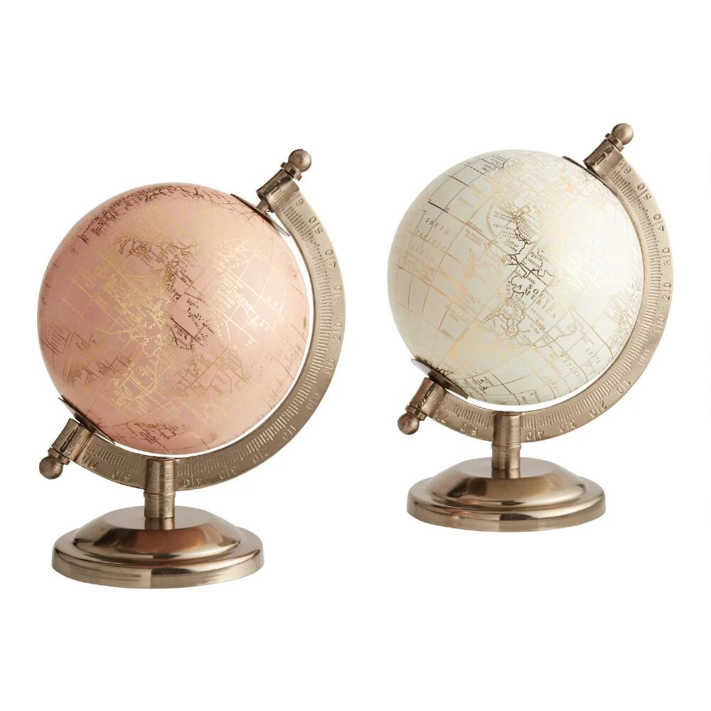 Dress up your desk or bookshelf with our pretty pair of miniature globes in ivory and blush pink. Emblazoned with gold lettering and spinning atop brass-finished stands, they’re worldly and wonderfully chic.