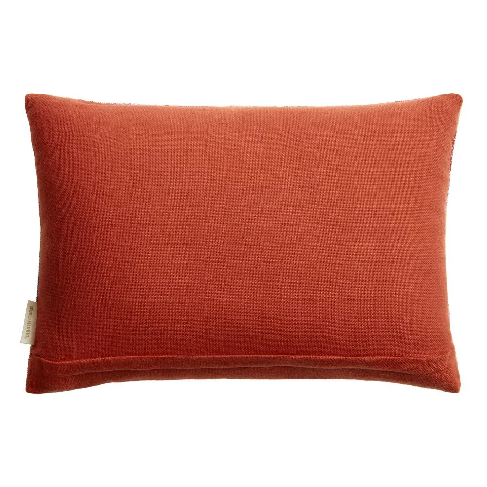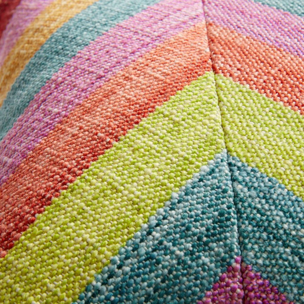 Add a pop of hot color and contemporary geometric design to your sofa or chair with this indoor-outdoor lumbar pillow. Featuring a vibrant zigzag pattern including woven strips of fuchsia, coral, teal, orange and more, it’s finished with a solid coral back. Suitable for use in your lounge or outside on your patio or deck, it’s made with an innovative process that puts recycled water bottles to good use.