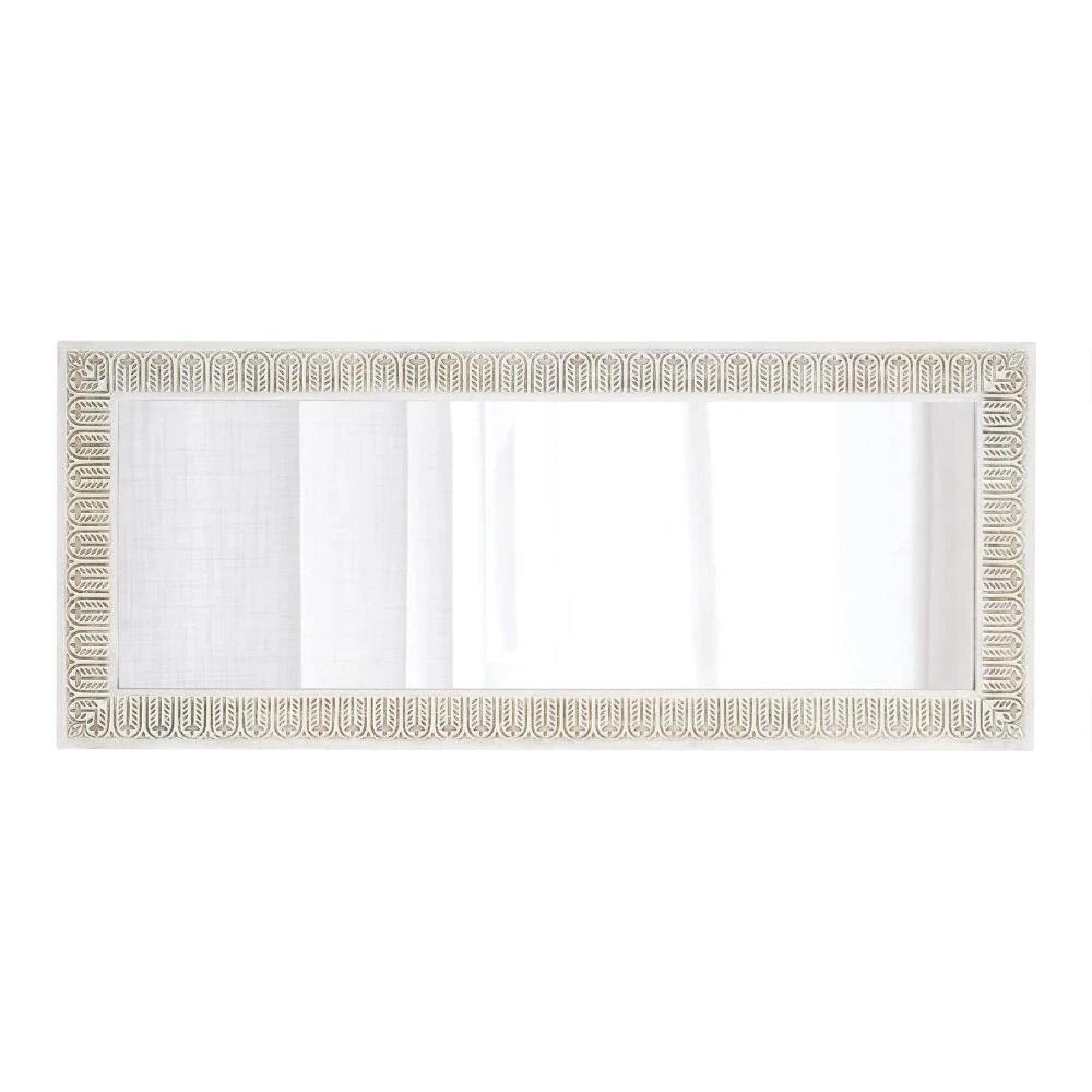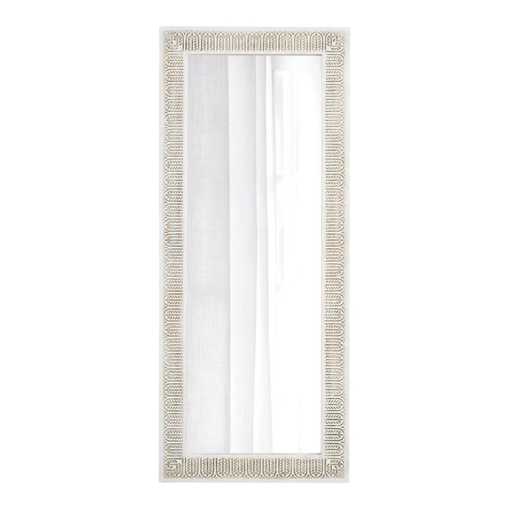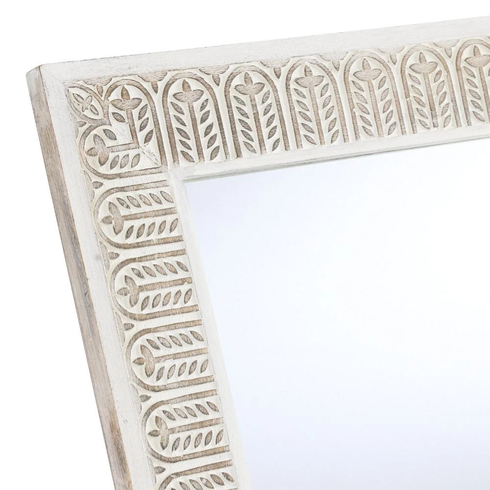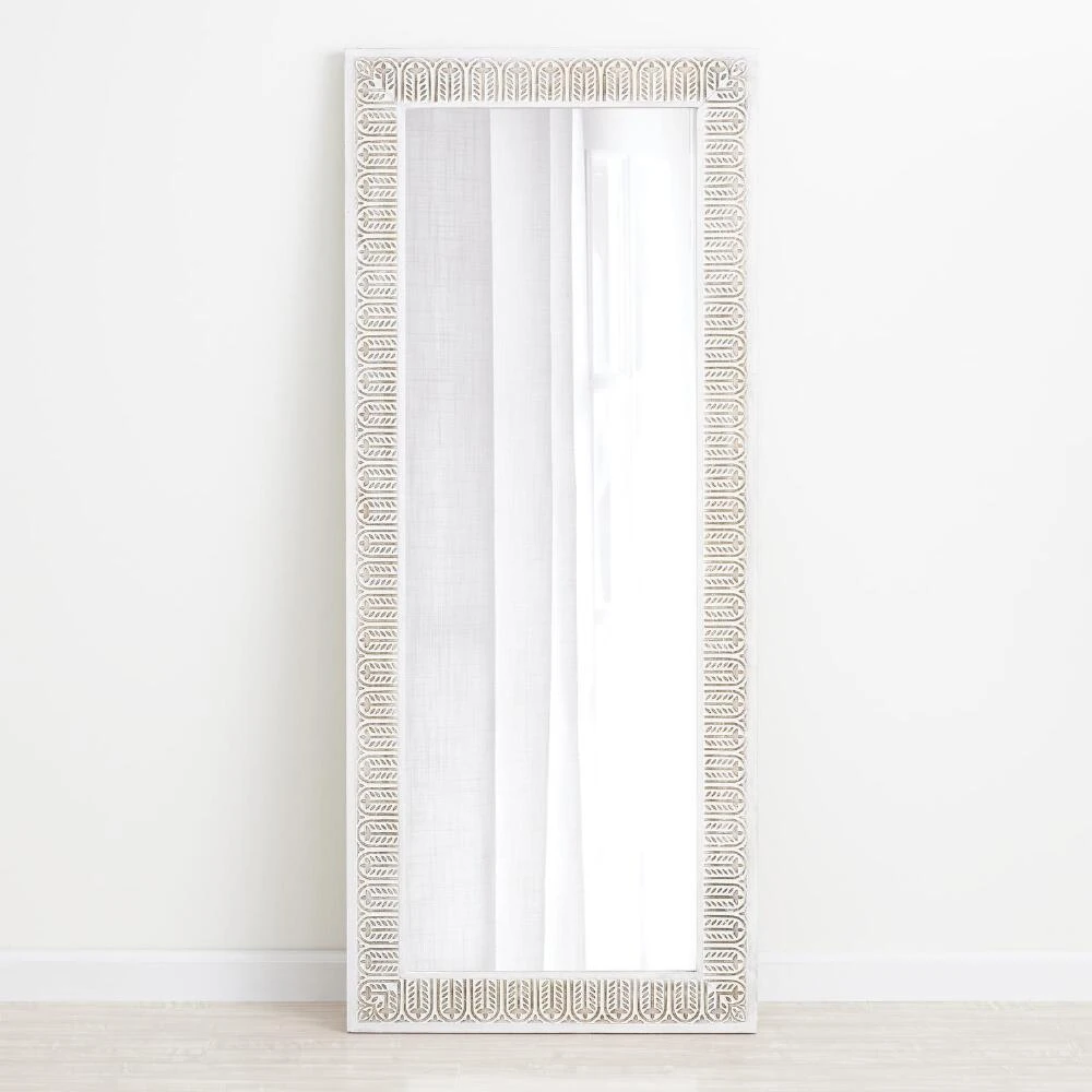 Carved with a nature-inspired leaf motif and finished in an antiqued whitewash, our full-length mirror brings a calming vibe to your bedroom or living room. Creating a more spacious look and feel in your space with its reflective qualities, this rustic wood mirror amps up the texture and pattern appeal in any room.