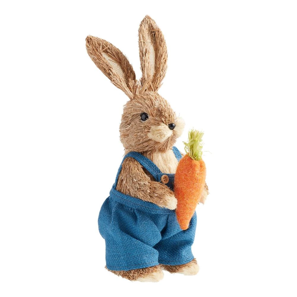 Handcrafted from natural sisal and adorably attired for spring, our rustic rabbit lends farmhouse-inspired charm to the Easter season. This blue-clad farmer is handsomely dressed in burlap and buttons and holding a bright felt carrot, ready to add a delightful dash of color to your tabletop or mantelscape.