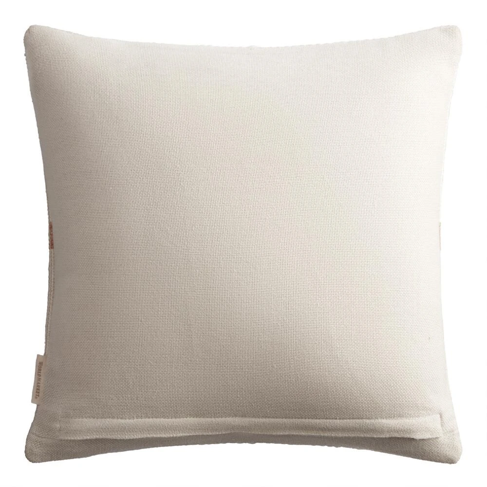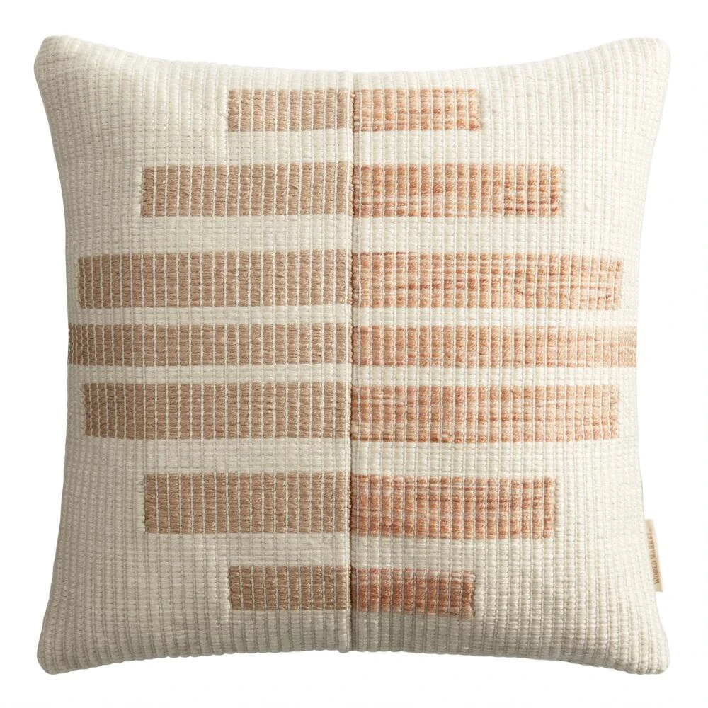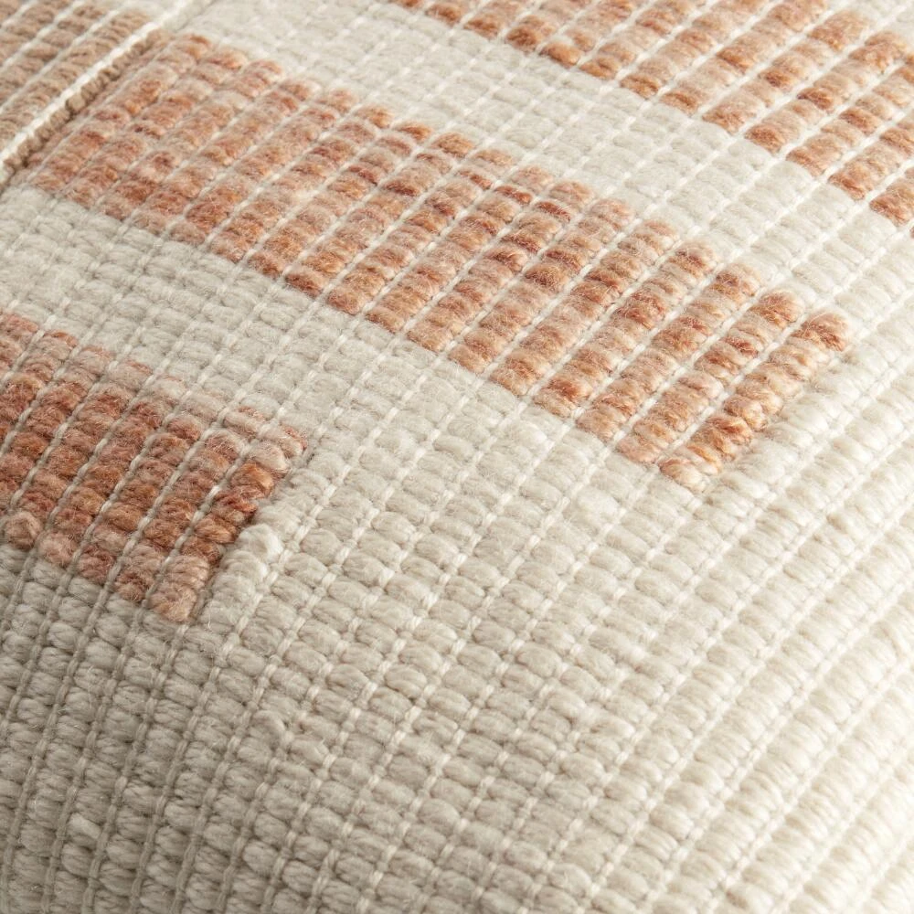 Kick back and relax in modern fashion with our geometric indoor-outdoor throw pillow. Complete with a removable insert, this toss pillow is consciously crafted with an innovative recycling process that reuses discarded water bottles. Showcasing earthy orange and tan stripes on an ivory ground, this sustainably minded home decor piles on the plush comfort in any seating area.