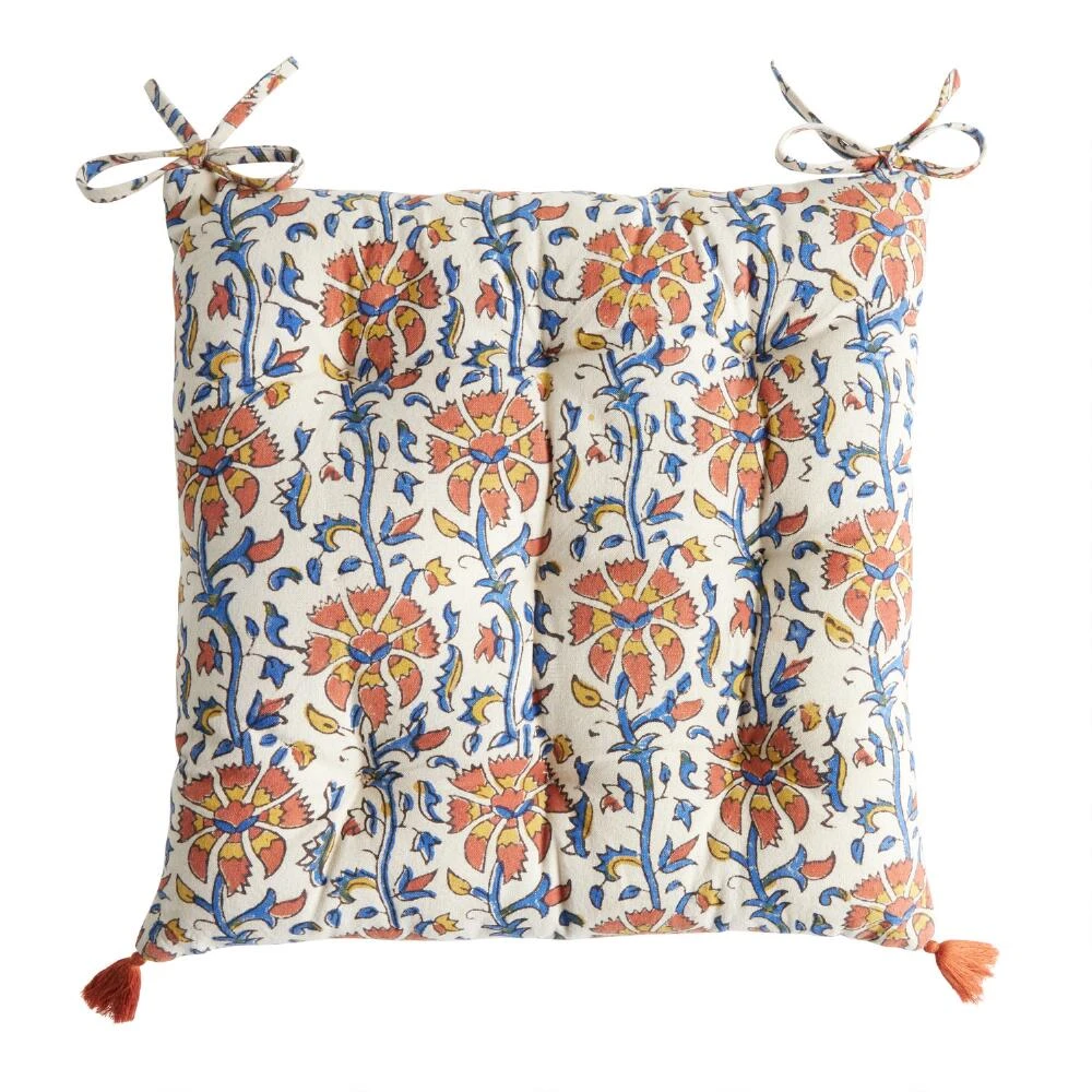 This handcrafted Jaipur block-print chair cushion will instantly brighten up your home with its cheerful floral pattern in red, blue, black and gold. The tradition of block printing is an intricate process Indian artisans have been perfecting since the 12th century. A design is hand-drawn and carved into a wooden block, then dipped in dye and stamped carefully on stretched, hand-dyed fabric. Each one-of-a-kind piece is a unique work of art.