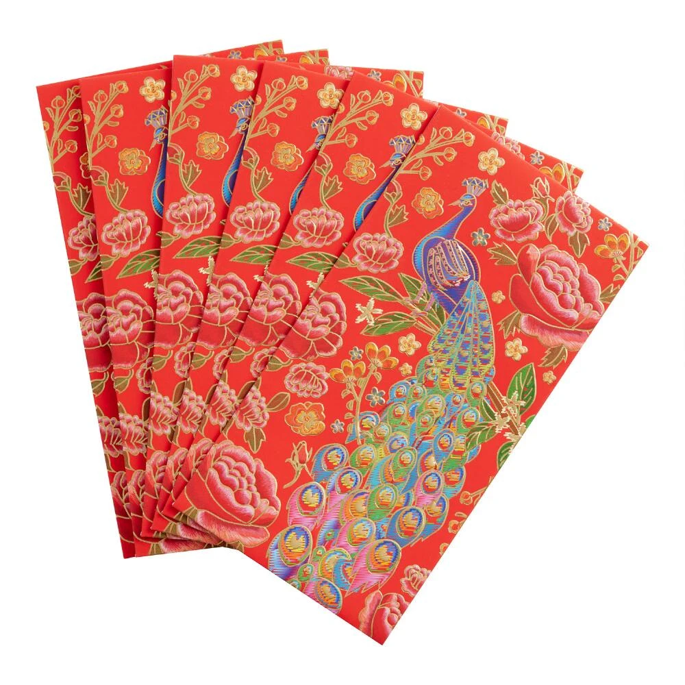 A Lunar New Year tradition symbolizing luck and prosperity, these red envelopes are meant to be filled with money and given to family and friends. This pack includes six of the auspicious envelopes, each richly embossed with a peacock design.
