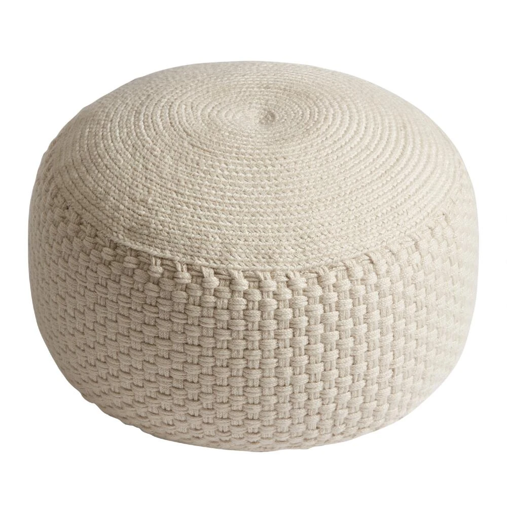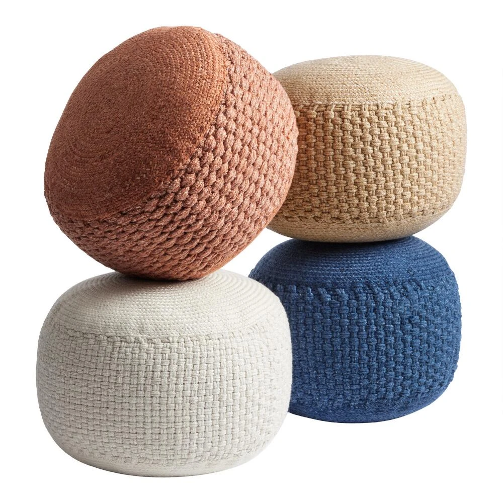 Our versatile outdoor floor pouf features a basketweave texture on the sides and a concentric braided pattern on the top. This versatile accent piece adds additional seating or a comfortable foot rest indoors or out. Available in your choice of chic shades, our patio pouf is made with an innovative recycling process that puts discarded water bottles to good use.