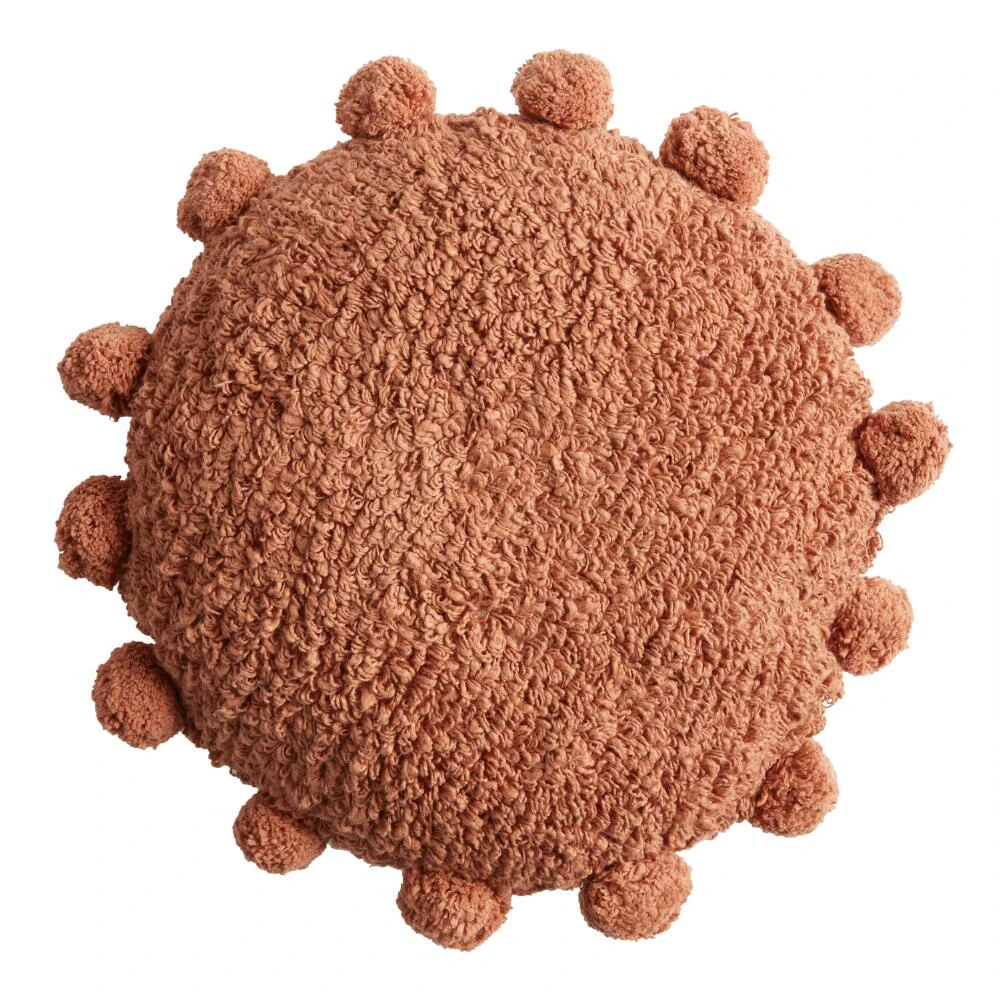 This rust-colored pom-pom accent pillow is a playful addition to your stylish home decor. The warm, rich tone will make any room feel instantly cozy and is neutral enough to mix and match. With nubby tufting on the front, fluffy pom-pom trim and a solid canvas back, this round toss pillow is a textural treat for your living space.